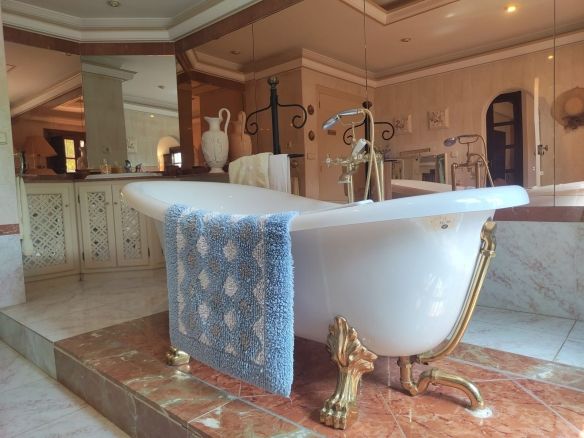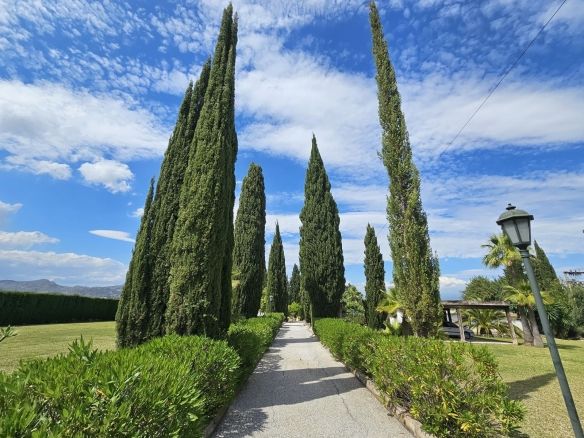 From the moment you enter via the grand, tree-lined driveway, it’s clear this is no ordinary residence. Palm trees and cypresses line the private approach, leading to generous parking areas and lush green spaces. The grounds feature three impressive swimming pools, ideal for enjoying Andalusia’s abundant sunshine, as well as a series of pergolas and terraces that create tranquil outdoor lounges and elegant entertaining spaces.