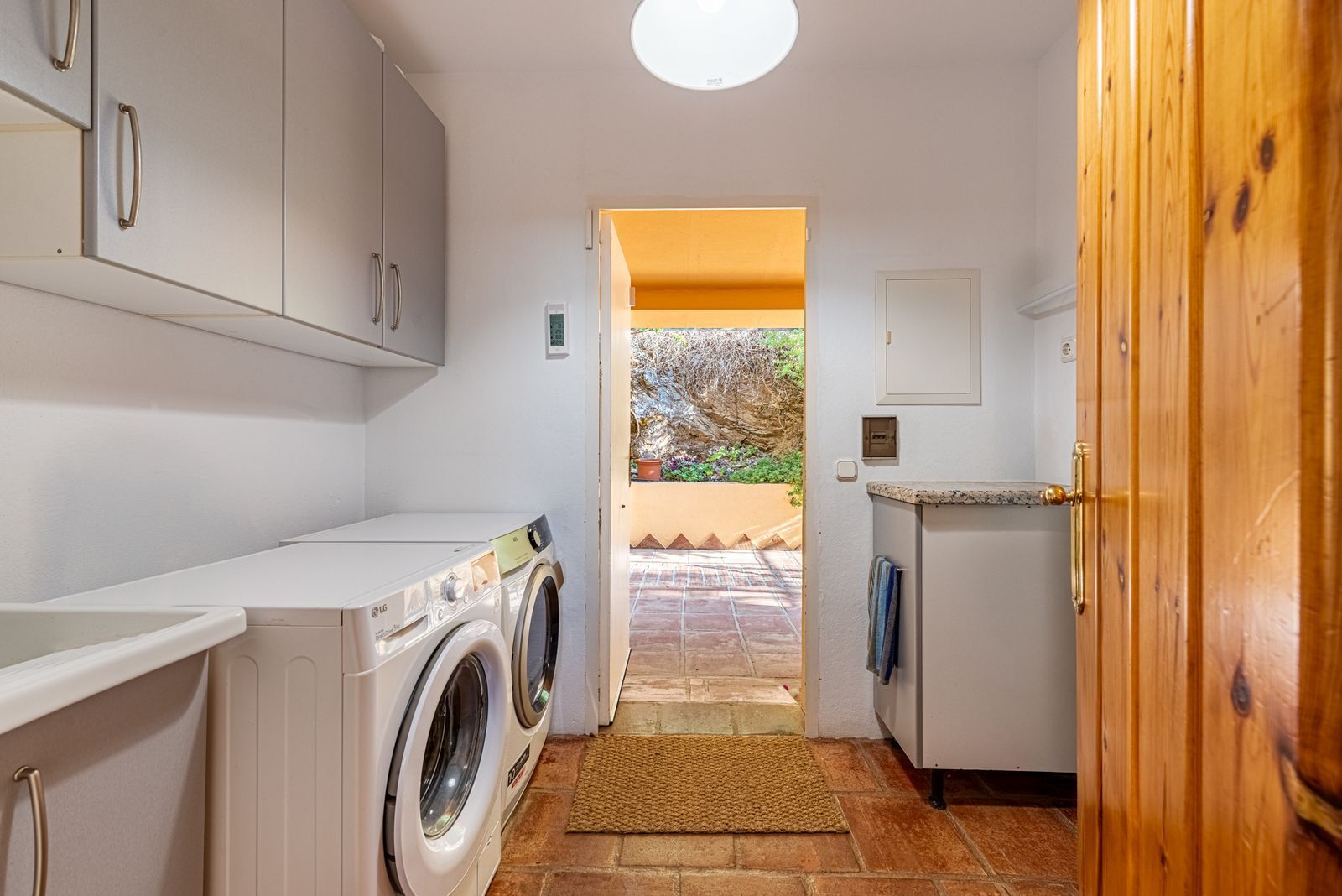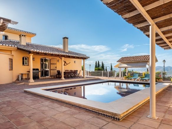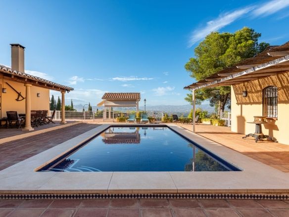 Outdoor living is equally impressive: a self-cleaning saltwater swimming pool (8 x 5 m) is complemented by a BBQ area, a 35 m² poolside porch, an 80 m² patio, and a 60 m² covered parking area. At the front of the house, a charming pergola with a dining table provides the perfect setting for al fresco meals while taking in stunning valley views.