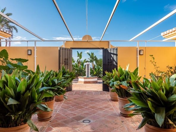 The approach to El Ksar is as impressive as the property itself: an extensive, grand driveway with a beautiful fountain creates a striking first impression, guiding visitors through the landscaped grounds toward the home. What truly sets the estate apart is its unique architectural design, built around a magnificent interior patio filled with plants at the heart of the house. This extraordinary feature floods the residence with natural light and air, creating a serene and private oasis rarely found in any property. The home’s interior is further enhanced by artisanal Mazari-style flooring with bronze inserts by David Marshall, adding a unique touch of elegance and craftsmanship throughout.