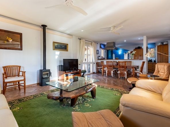 The main house spans approximately 392 m² of built space and includes three bedrooms and three bathrooms, plus a guest toilet. Two bedrooms are located on the ground floor, while the upper-floor master suite enjoys complete privacy and sweeping valley views. A basement with a secure safe room adds both functionality and peace of mind. The estate also features a 40 m² independent guest house with 1 bedroom and bathroom.