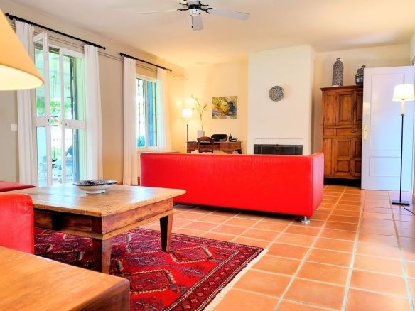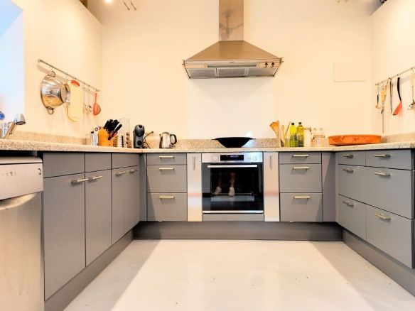 The spacious living room with fireplace and large windows offers lots of light and a warm, inviting atmosphere. The large, fully fitted U-shaped kitchen with high ceilings connects to a practical utility room with an extra fridge, washing machine, and dryer.