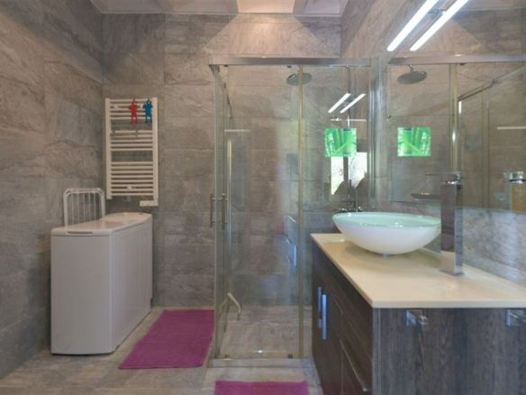 We go out to a first guest apartment on the ground floor, next to a large private and closed garage, in the other corner of the ground floor we have a second guest apartment exactly the same as the first.