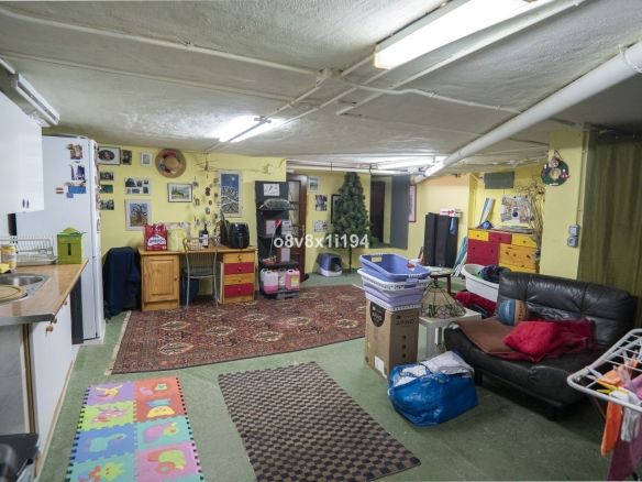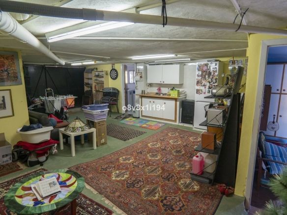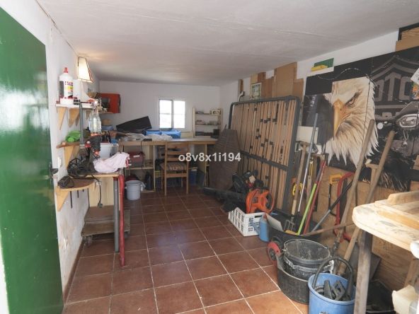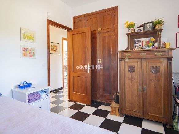 Descending an exterior staircase from the kitchen leads to the ground floor, where you'll find an additional bedroom, a large storage room with a kitchenette and bathroom, and direct access to the garden with a private pool. There's also a terrace-like space here, ideal for barbecues and outdoor gatherings.