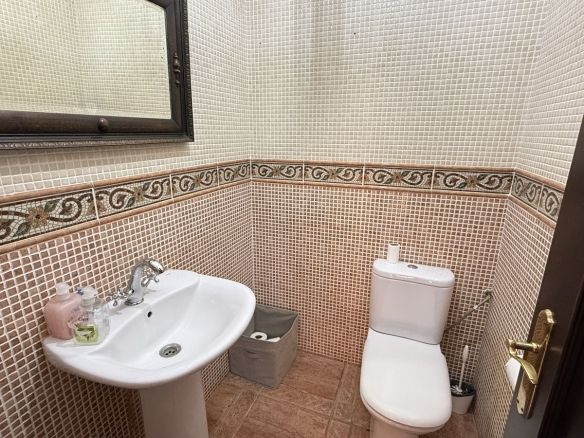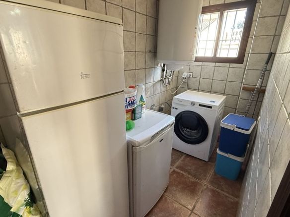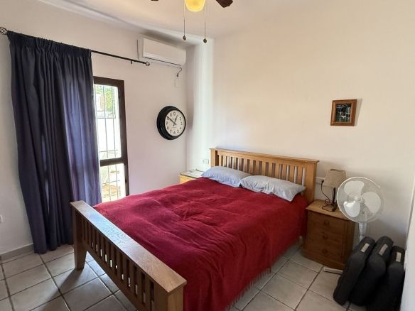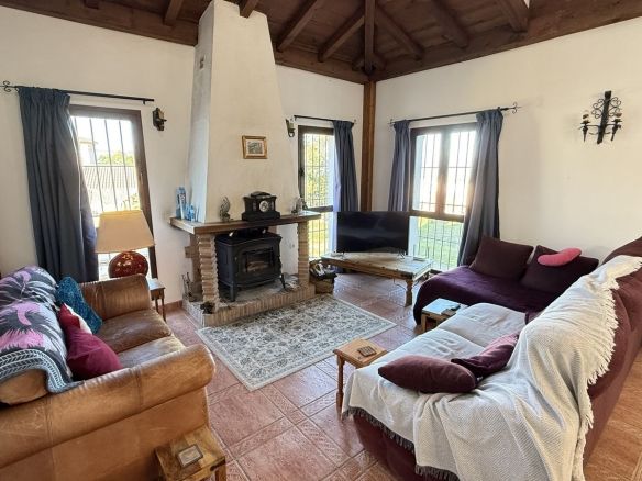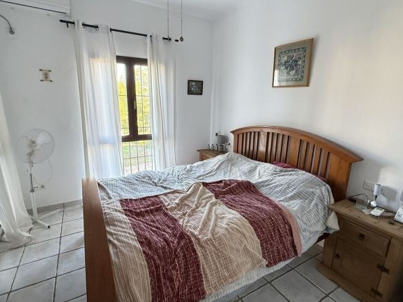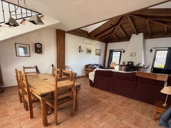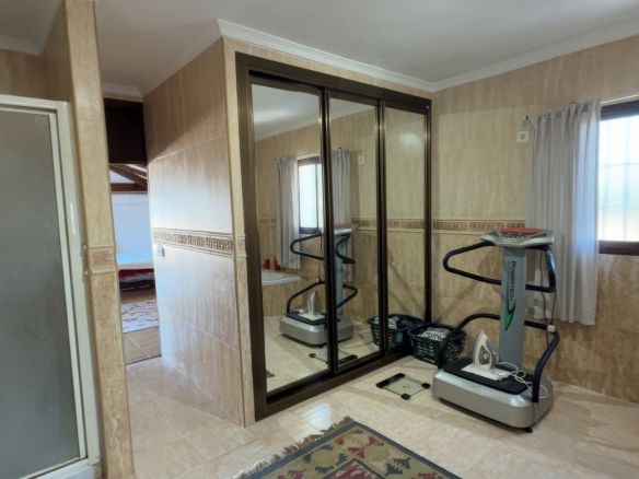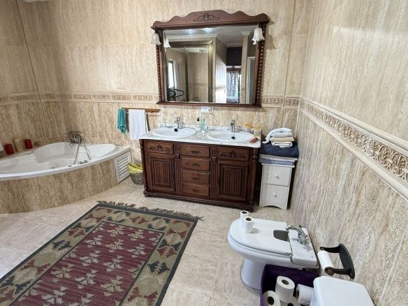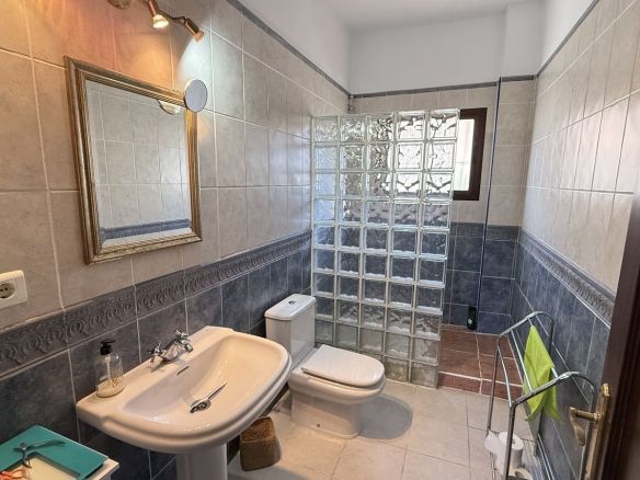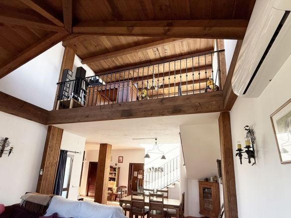 The ground floor of the villa is finished in a rustic style and benefits from a generous living room with fireplace, fully fitted kitchen with utility room, 3 double bedrooms (all with fitted wardrobes), 2 bathrooms, and a guest WC.