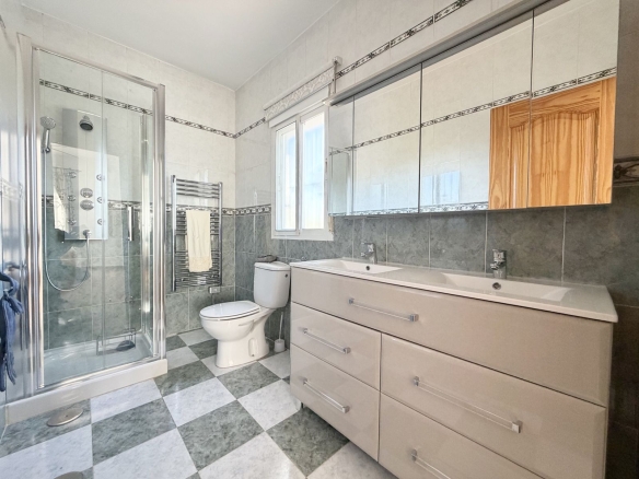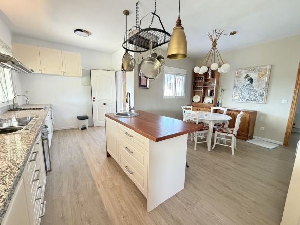 Outside, the property boasts a well-maintained garden, private swimming pool, and covered terrace, ideal for enjoying the Mediterranean climate. Additionally, there is a large workshop that can be converted into guest accommodation, as well as a carport and several storage rooms.