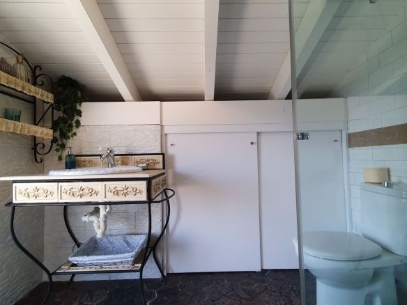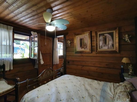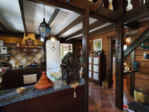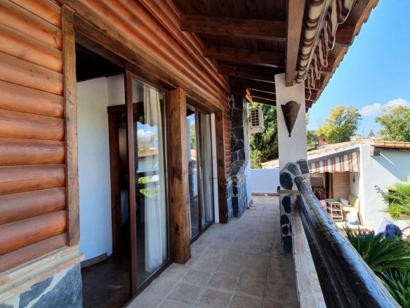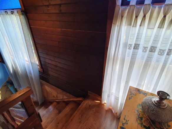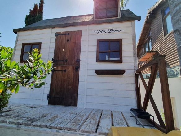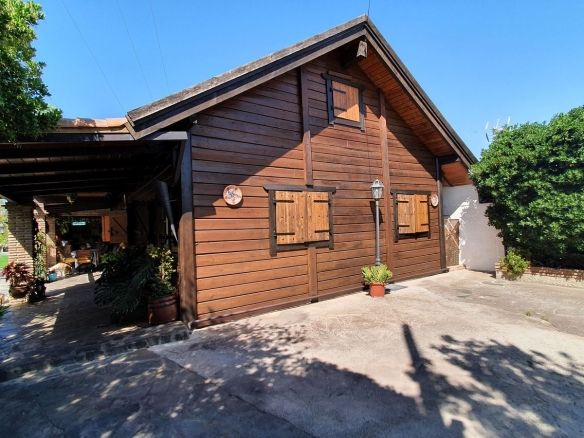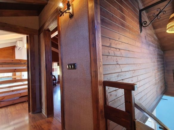 The first house, with its charming wooden design, boasts one bathroom, three bedrooms, a spacious living room, kitchen, terrace, and a barbecue area.