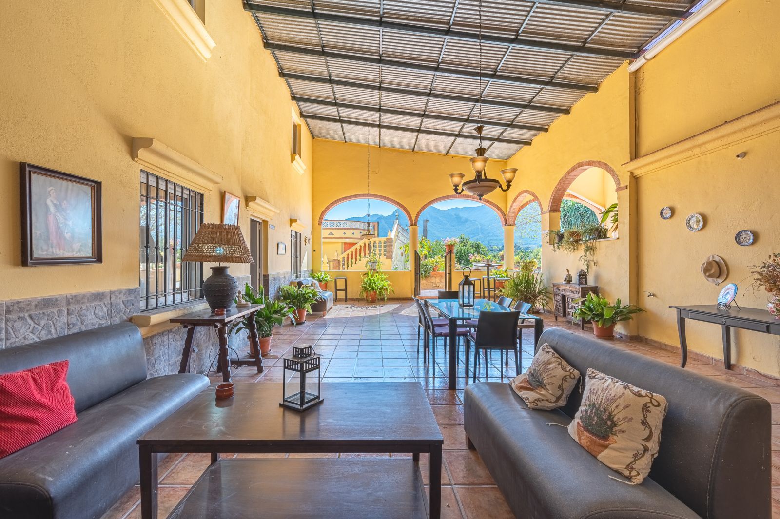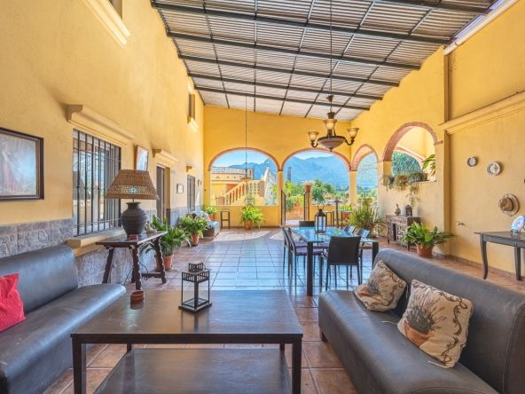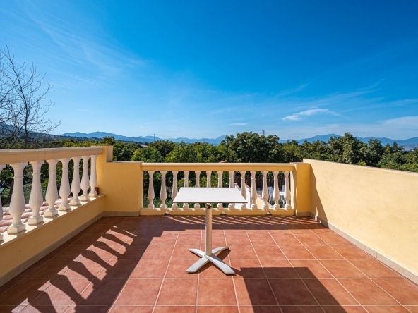 Large common uncovered space with bar, barbecue and dining table for family meetings or friends, all this next to the swimming pool located on a first floor, with an extravagant view over the property and mountain