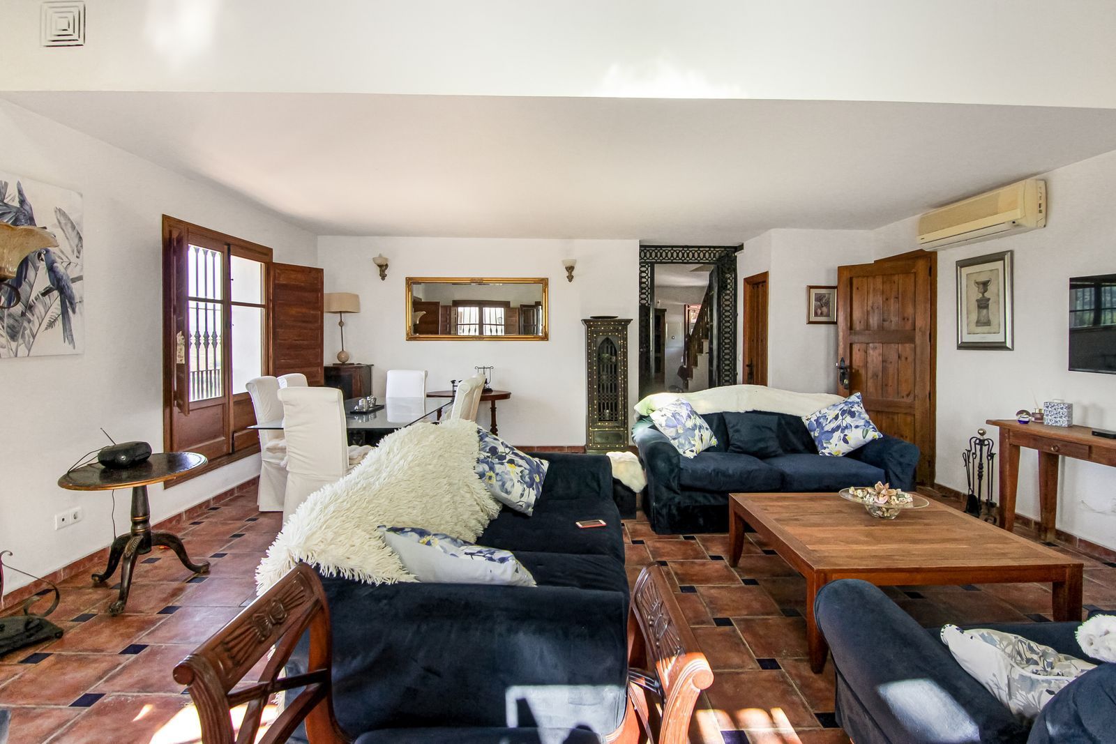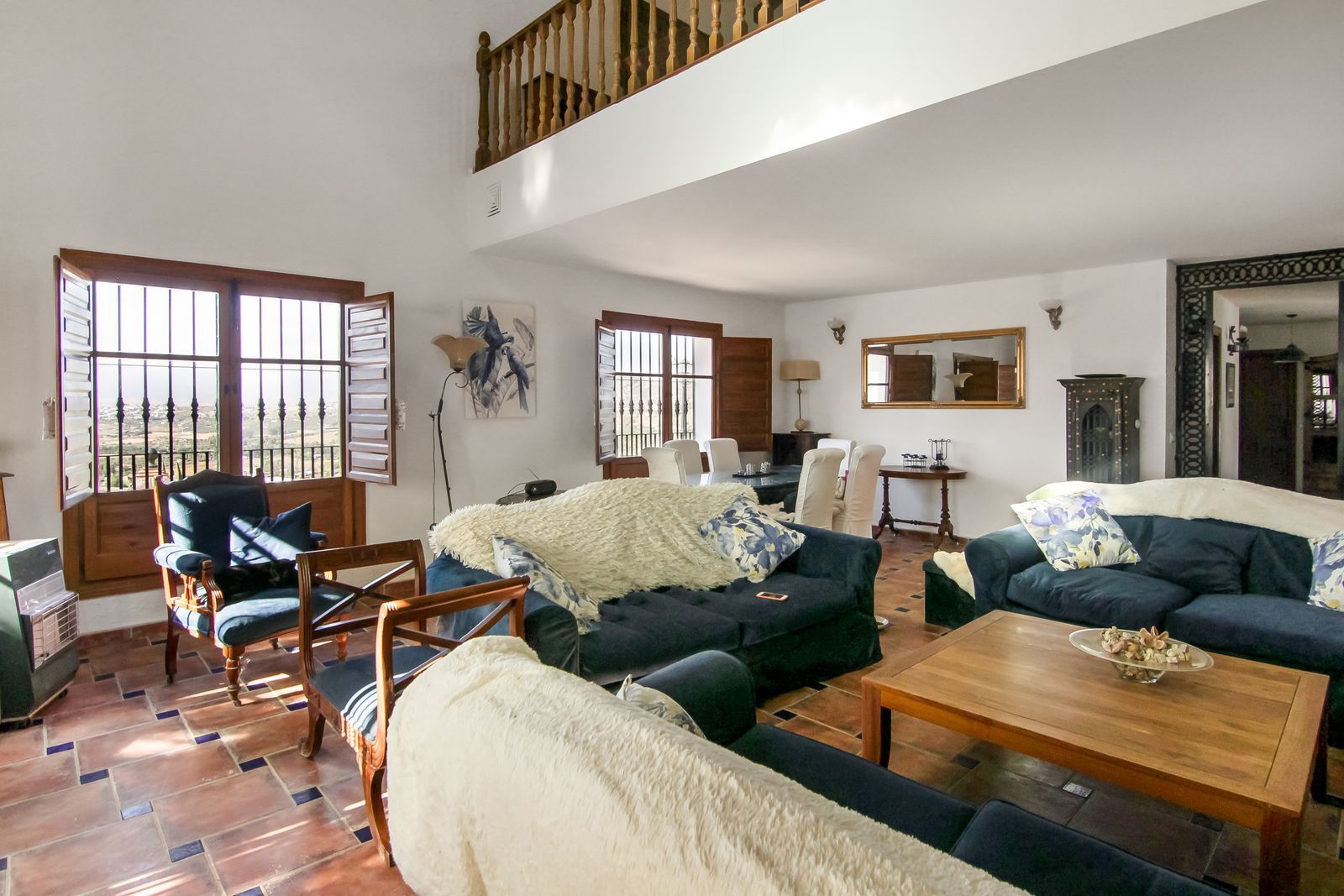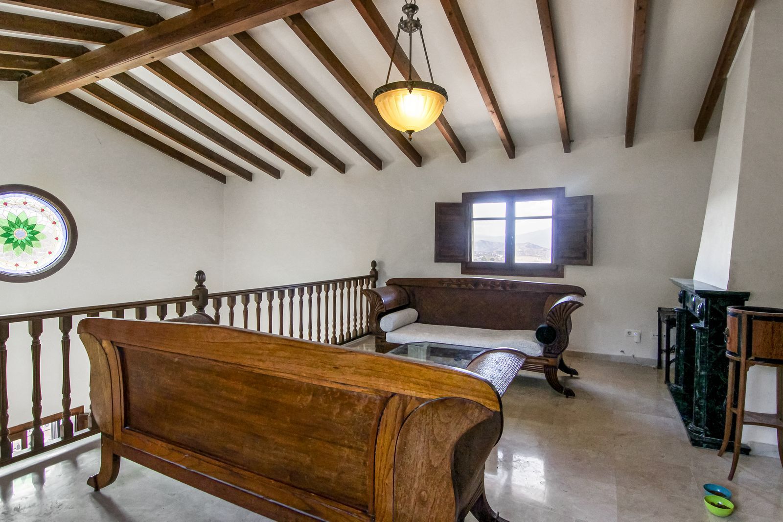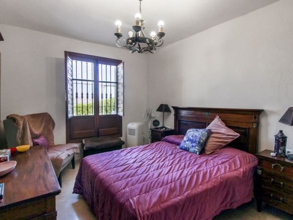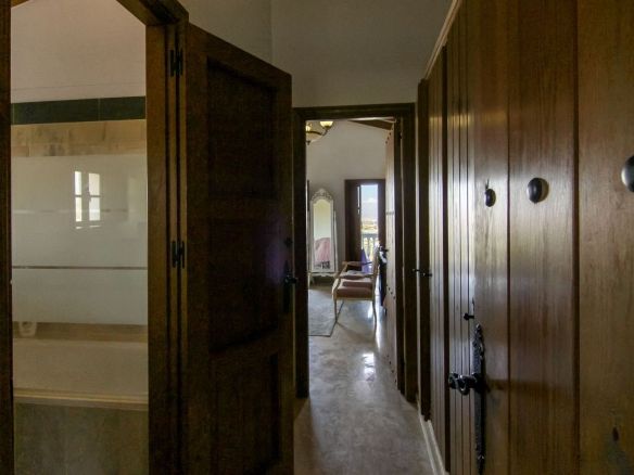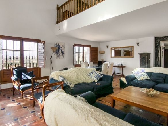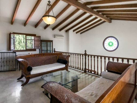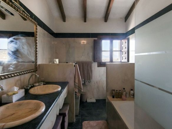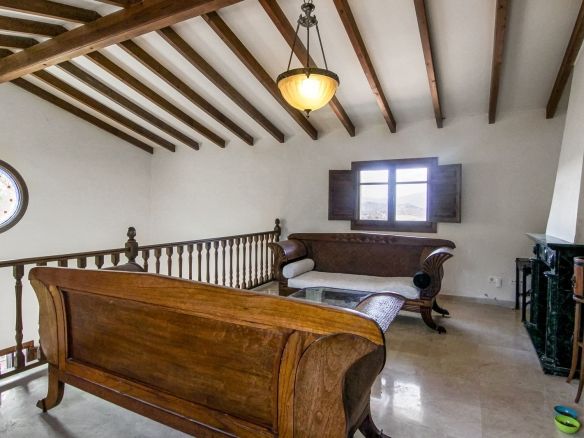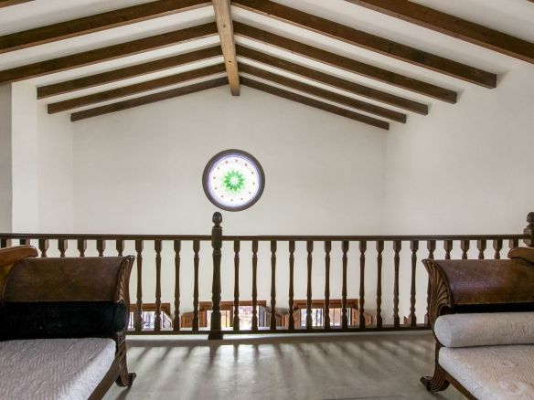 Living room is breathtaking, very spacious with high ceiling and big fireplace. Rustic style beautiful wooden framed windows, and indoor shutters, views to the countryside. There is plenty of natural light and access to the outdoor courtyard, from where you can also access the terrace. There is a potential and space to make overground pool. A lot of options for this idea.