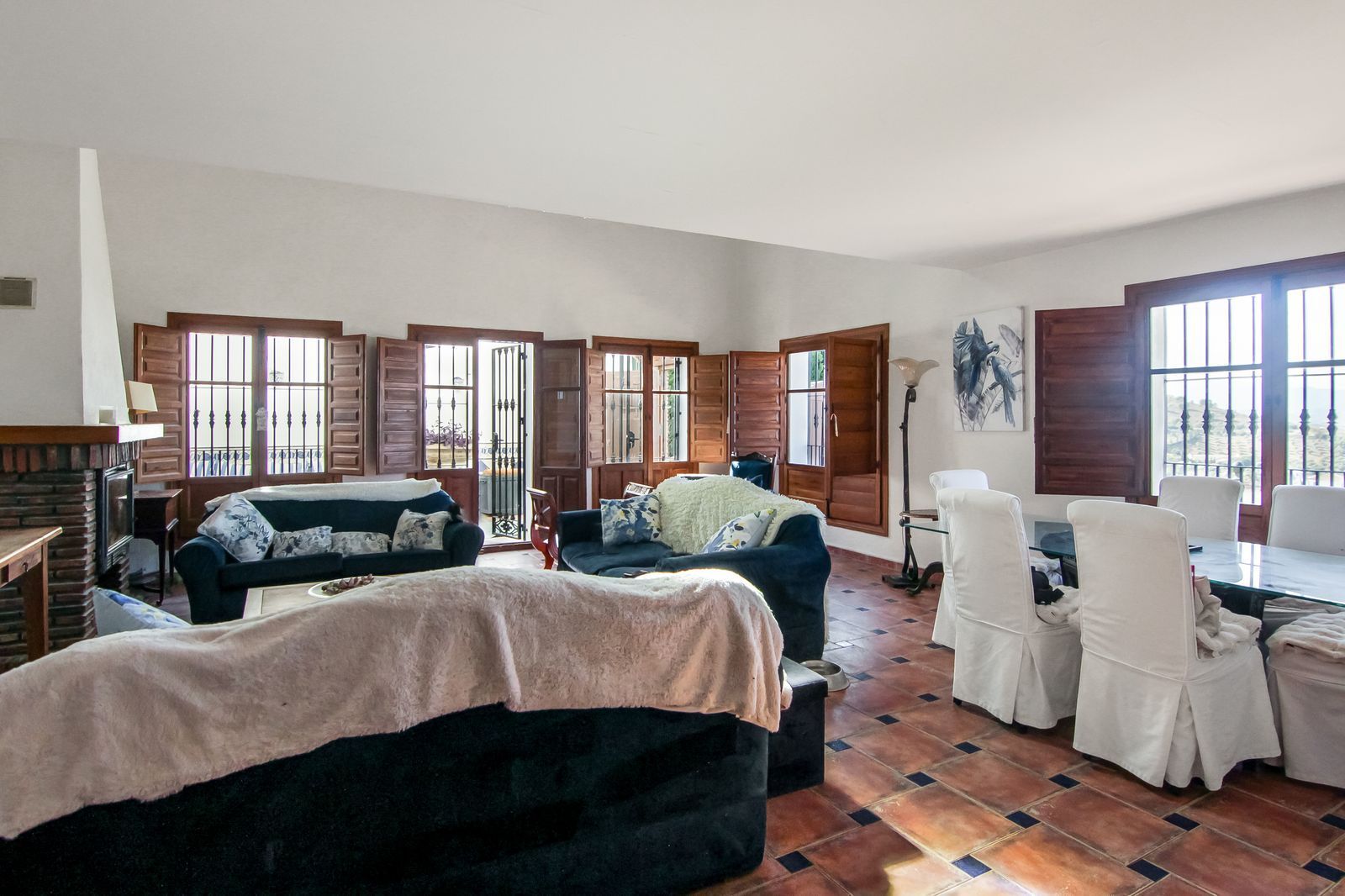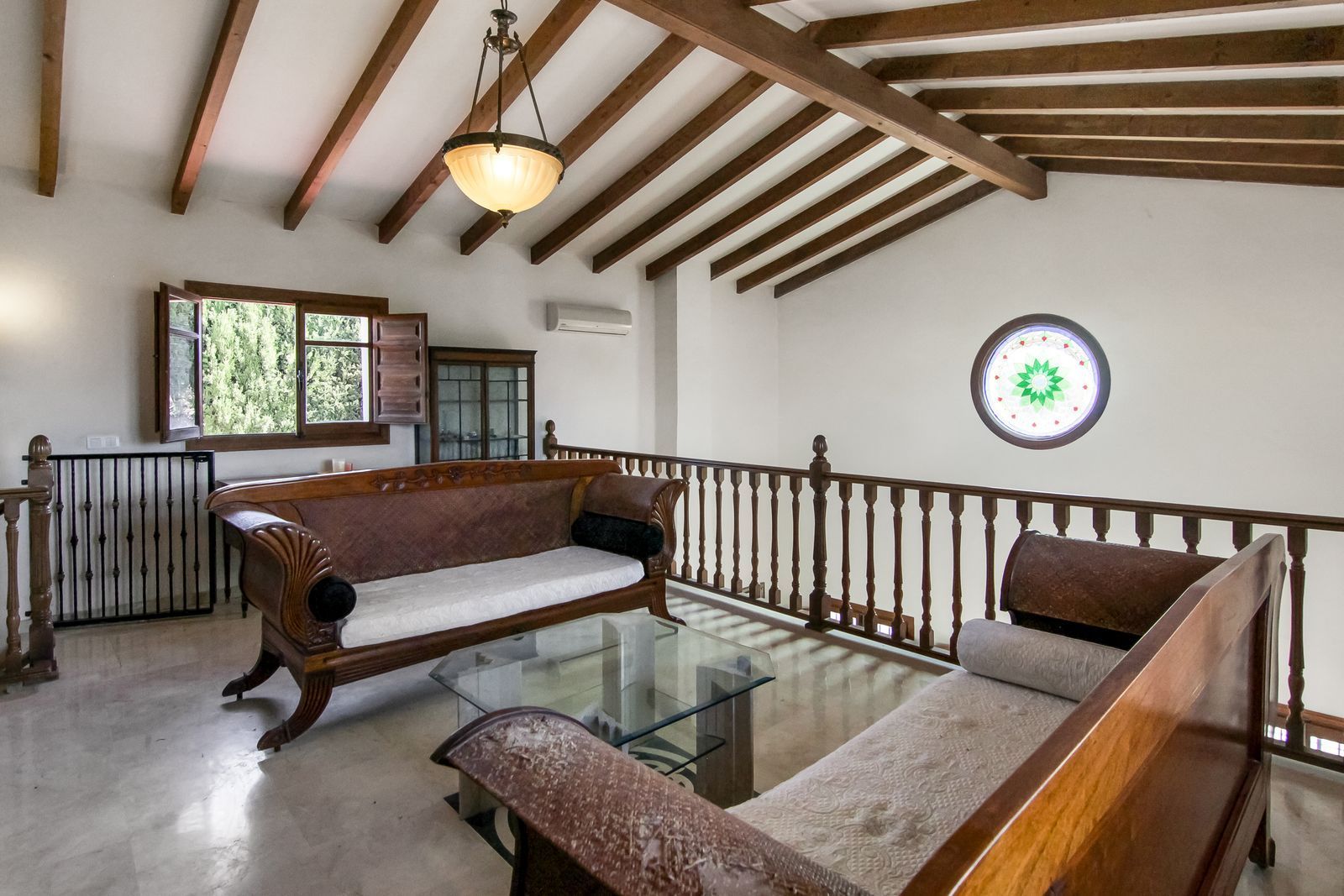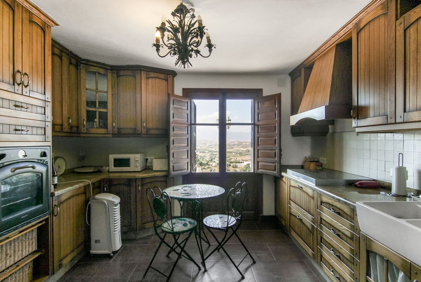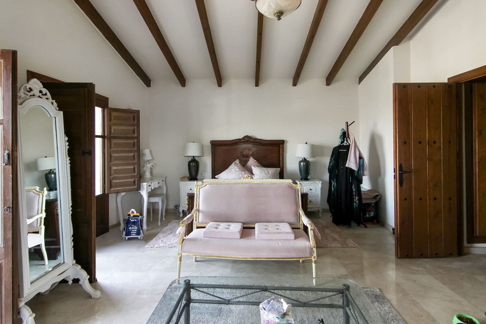 Living room is breathtaking, very spacious with high ceiling and big fireplace. Rustic style beautiful wooden framed windows, and indoor shutters, views to the countryside. There is plenty of natural light and access to the outdoor courtyard, from where you can also access the terrace. There is a potential and space to make overground pool. A lot of options for this idea.