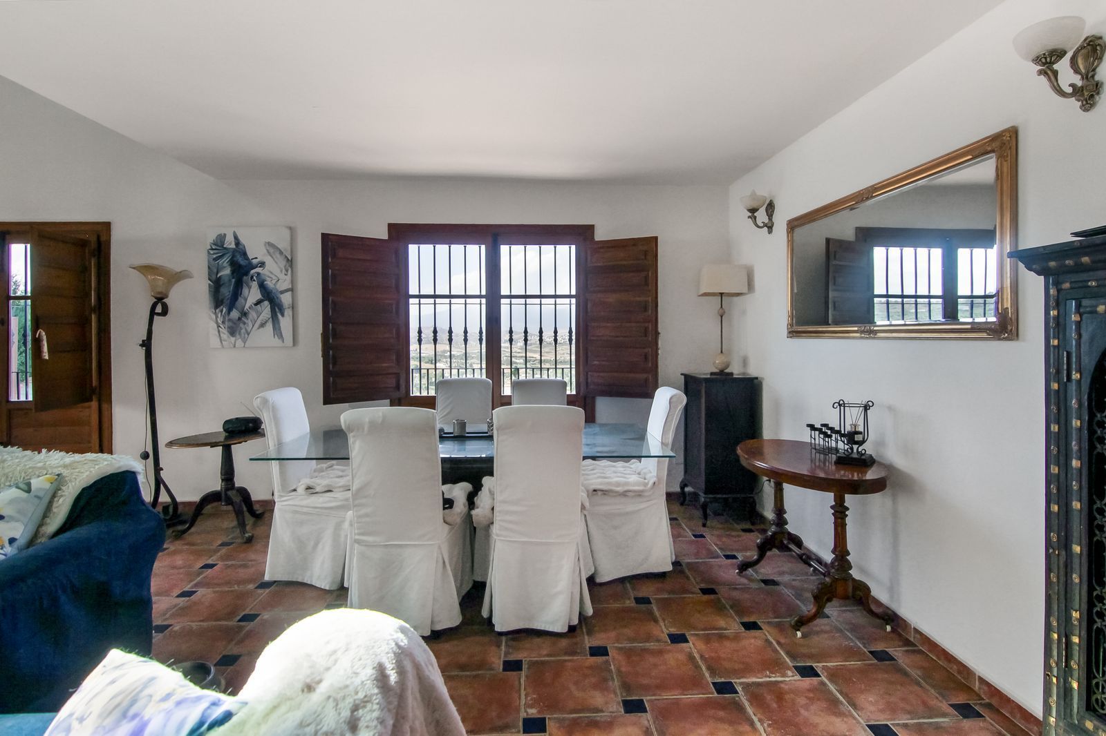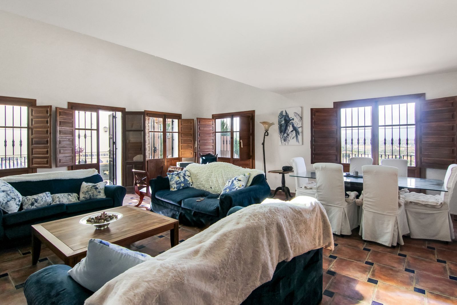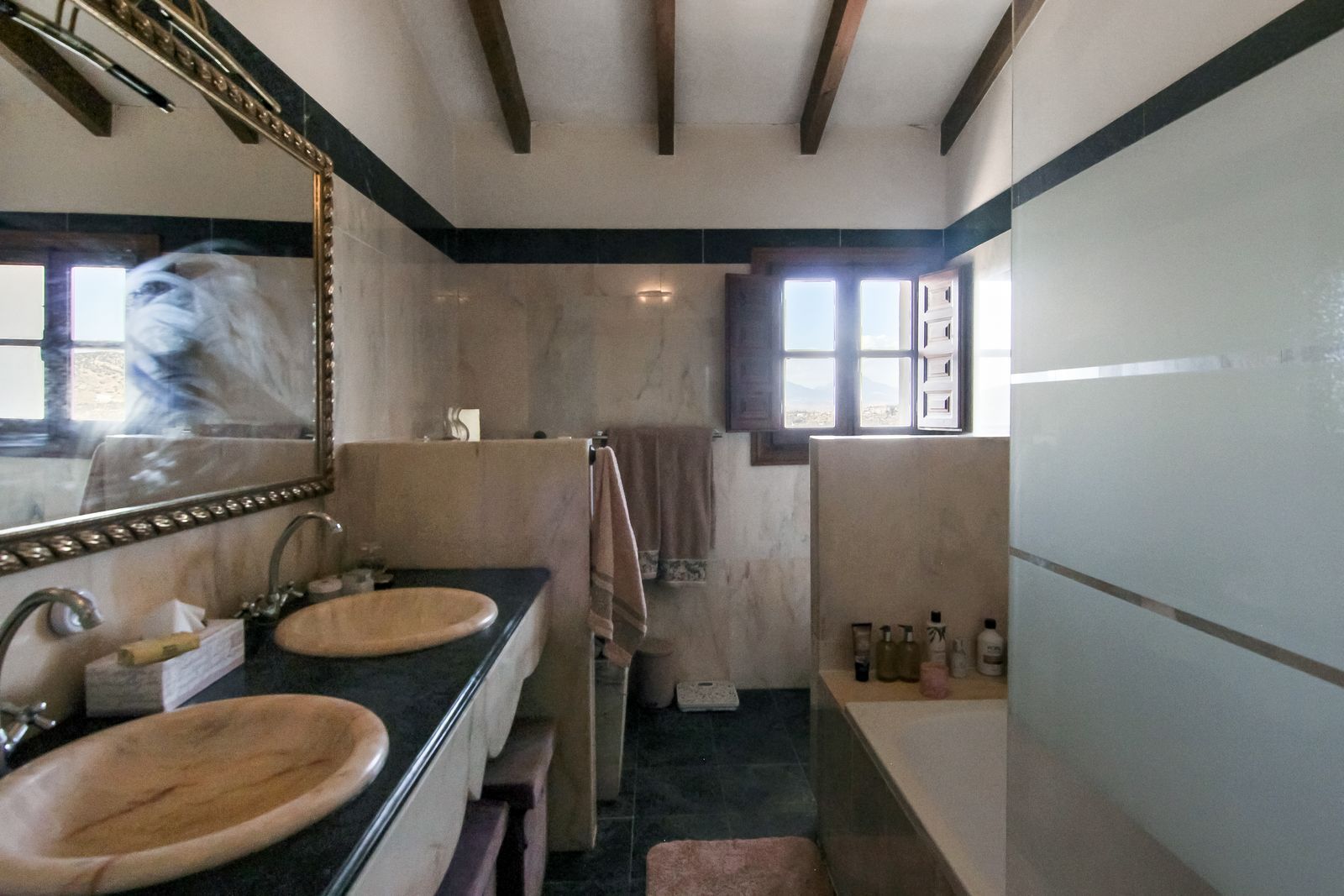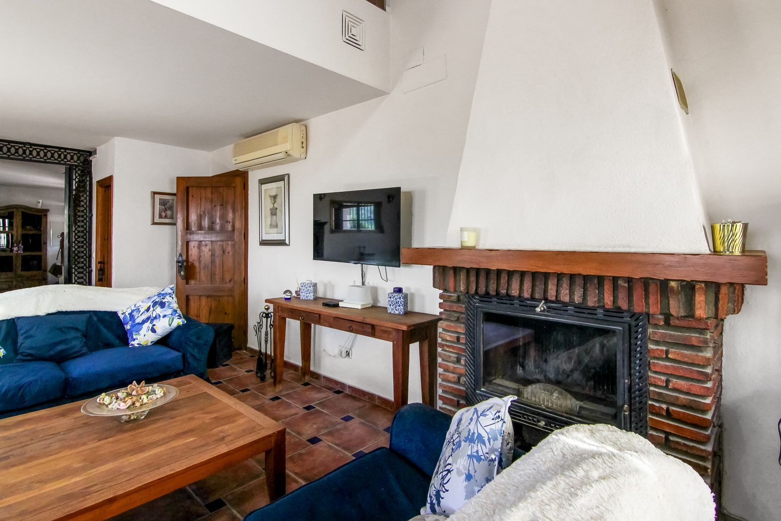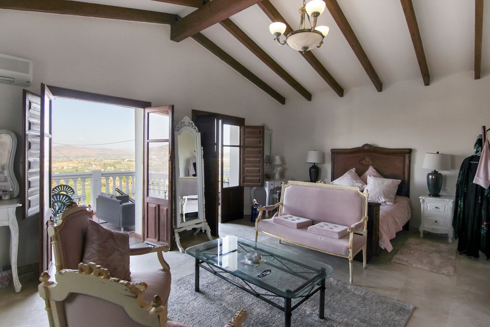 Living room is breathtaking, very spacious with high ceiling and big fireplace. Rustic style beautiful wooden framed windows, and indoor shutters, views to the countryside. There is plenty of natural light and access to the outdoor courtyard, from where you can also access the terrace. There is a potential and space to make overground pool. A lot of options for this idea.