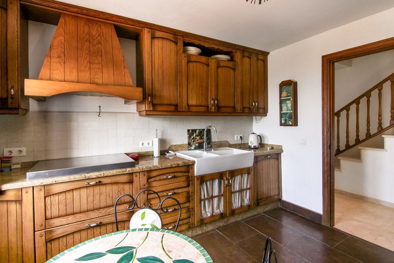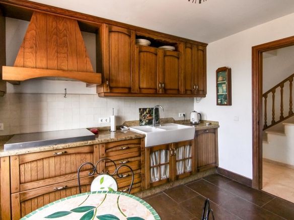 At the main entrance you will find two large bedrooms, with built-in wardrobes. There is a separate shower-room next to the bedrooms. On the way to the very spacious and open living room, you have a beautiful and rustic style independent kitchen. From the kitchen you can enter to the terrace, with amazing open views.