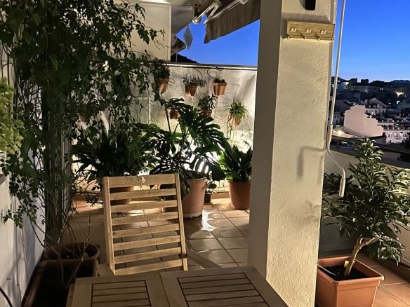 The apartment, located on the third floor with an elevator, is completely exterior and has large windows, including in the kitchen and bathroom, providing plenty of light even on the cloudiest days. Its magnificent orientation allows you to enjoy the outdoor areas both in summer and winter. The exterior is equipped with five awnings (three in the front and two in back) that provide magnificent shade, necessary on warm summer days. The rear terrace has indirect lighting (outdoor spotlights) and automatic watering equipment for plants, even reaching the pots in the kitchen window. Inside, the home also features hot/cold air conditioning and an Air Zone device to independently control the temperature of each room. The flooring is marble, and the windows are double-glazed aluminium.