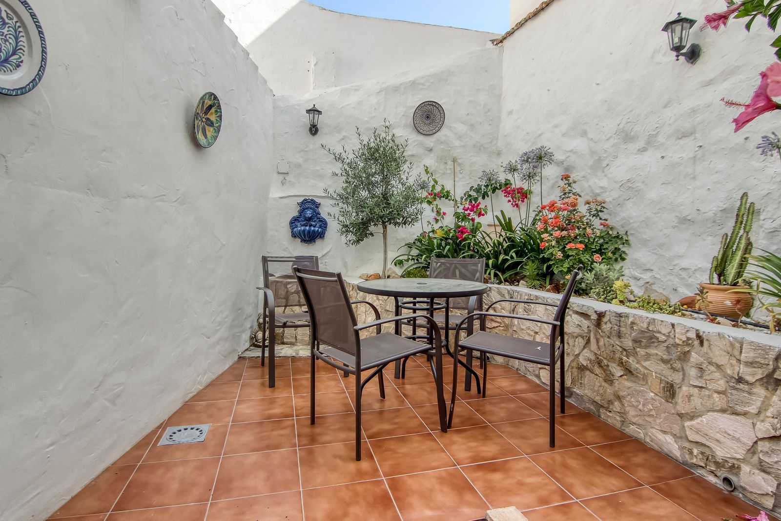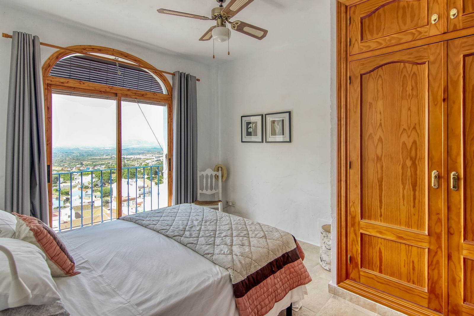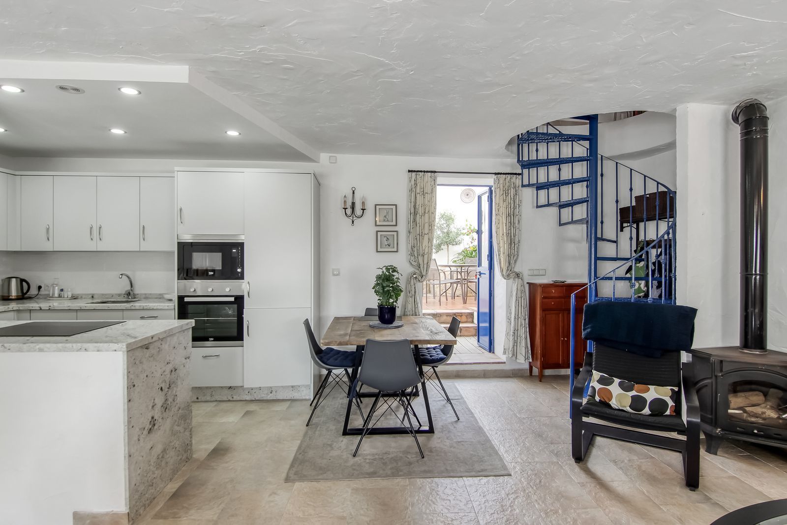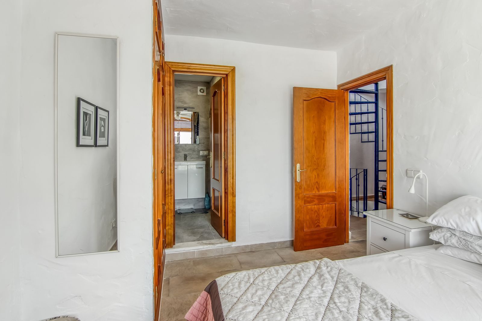 Spiral staircase takes you upstairs to the bedrooms and bathrooms. One floor more, and you enjoy your private roof terrace with amazing Guadalhorce Valley and pueblo views. Very practical utility/storage room on the roof terrace with washing machine.