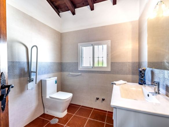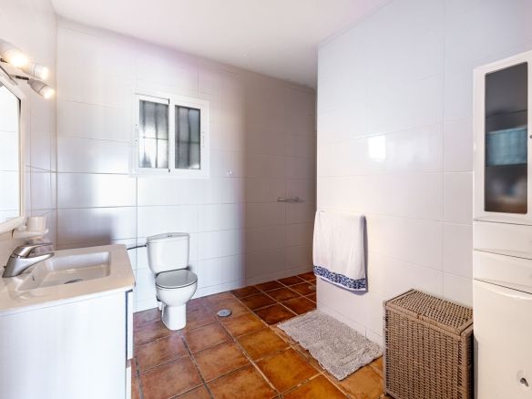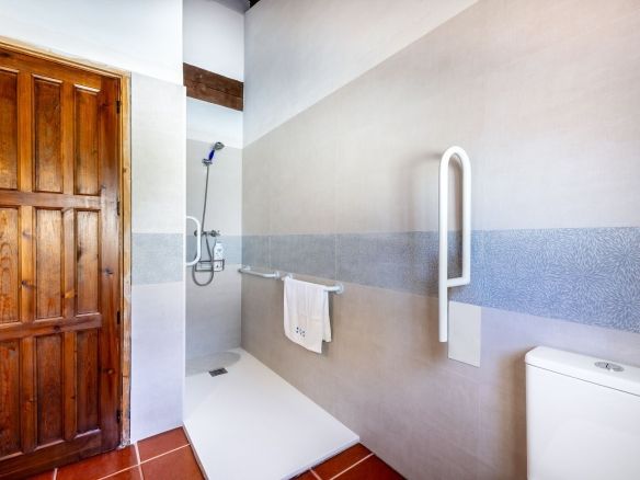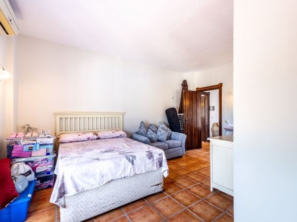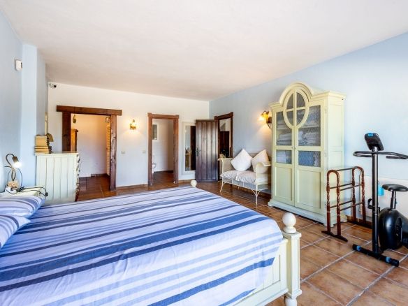 The wide staircase leads down to a large open plan landing area with understair storage leading to the two downstairs bedrooms. The primary bedroom, which is of a larger than generous size with ensuite bathroom and separate dressing room could be re-configured into an apartment or offer a fifth, additional bedroom. The second, also impressively large guest bedroom has an ensuite bathroom and again, could become a self-contained suite. Both rooms share views of the pool, garden, olive grove, mountains and countryside.