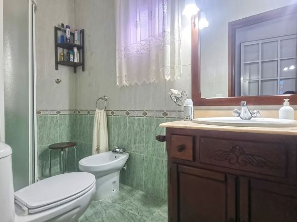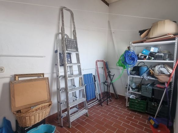 The second apartment offers three bedrooms, a cosy living-dining room with a pellet fireplace, a full bathroom with a shower, a kitchen, and an interior patio. From the patio, you have access to a rooftop area with two storage rooms, one of which is set up as a utility room.