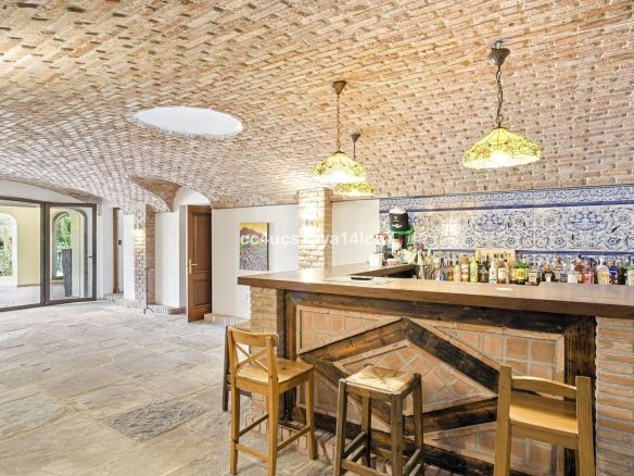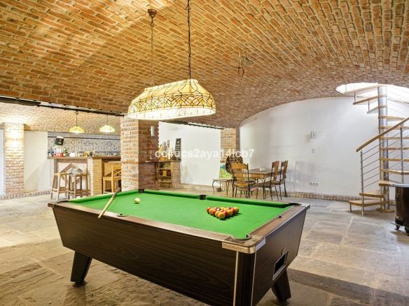 The basement level of the home is exceptionally unique for a Spanish property. It includes a fully equipped bar, pool table, utility room, gym area, and a separate room with shower and toilet, which could serve as an additional bedroom. One of the standout features is the cinema room, all finished with remarkable historical touches including 500-year-old Tudor bricks and flooring salvaged from a traditional cotton mill.
