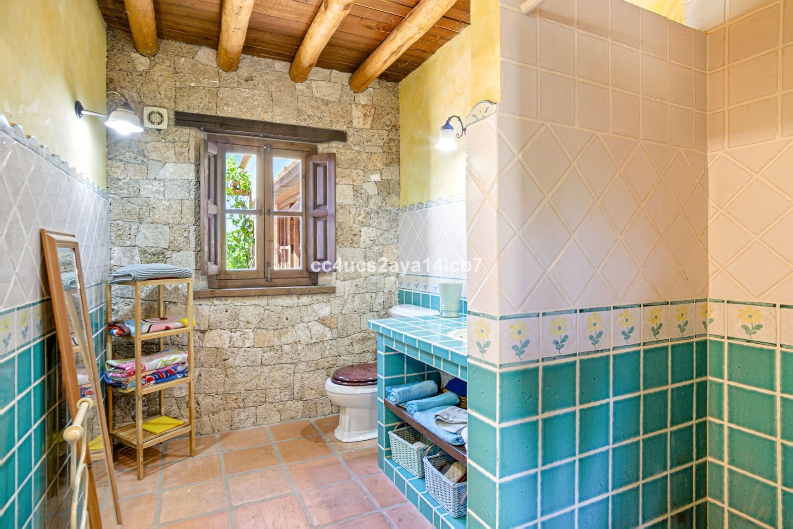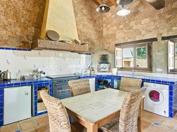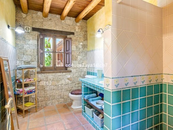 Adjacent to the main house is a charming guest cottage or casita, built with authentic Spanish limestone. This beautiful space includes two bedrooms, one bathroom, and a fully fitted kitchen complete with a pizza oven. The flooring is a distinctive feature, sourced from the original Guinness factory.