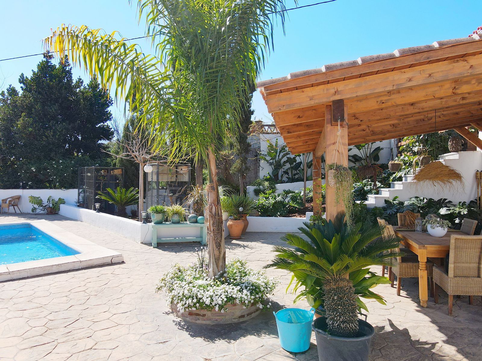 This property has a two-story house with 187 m2 useful built in 1969 and completely renovated in 2022. The facilities for electricity supply, water and the fireplace in the living room are new. The entrance is on the first floor, through a covered upper terrace with views of the garden, the pool and the natural environment that surrounds the property. From this we access a hall, kitchen with integrated dining room, a spacious living room, three bedrooms and a comfortable bathroom. From the upper terrace we go down to another covered uneven terrace, and from here we enter an independent annex with a living room, kitchen, 1 large bedroom with a built-in wardrobe and a bathroom.
