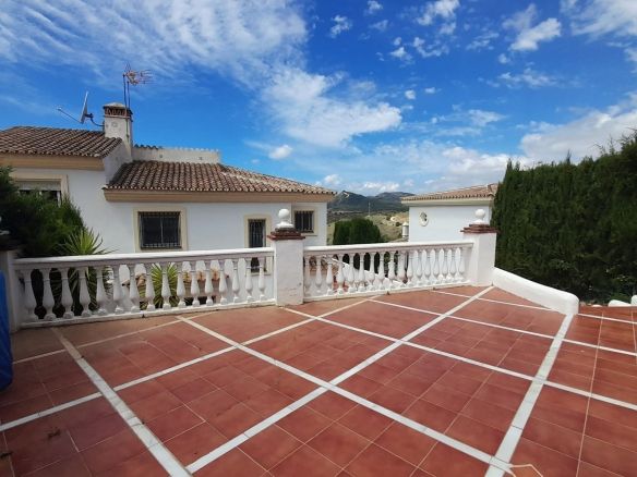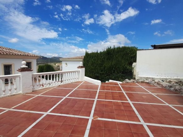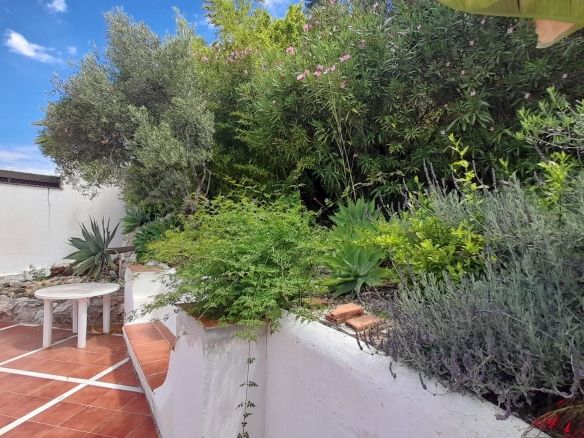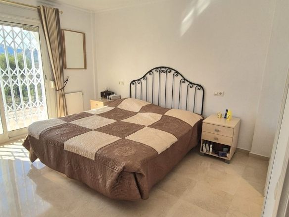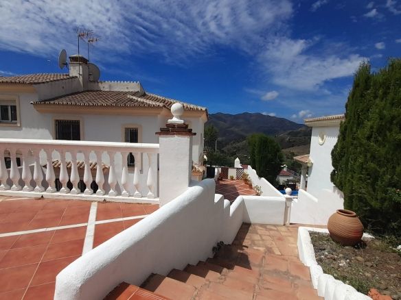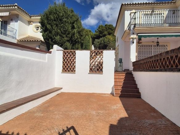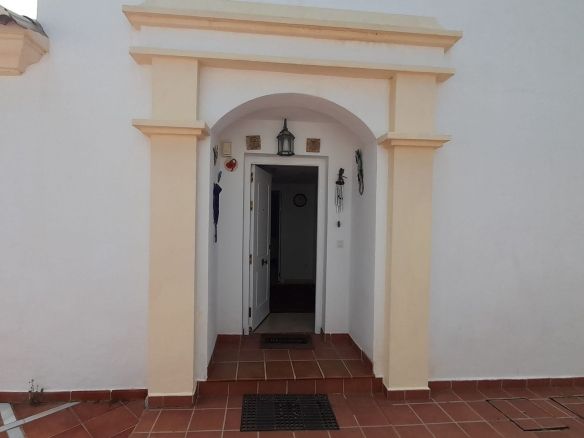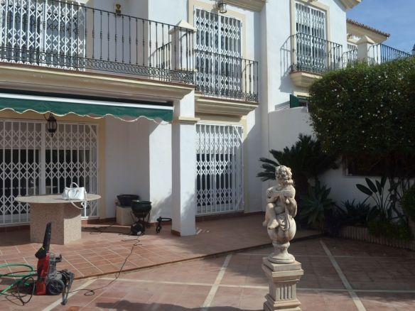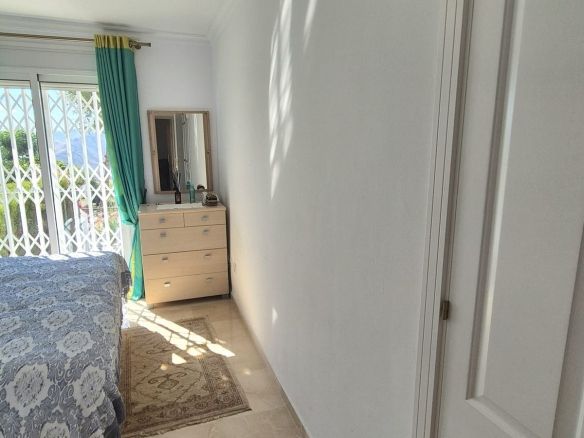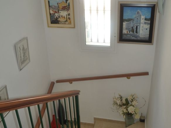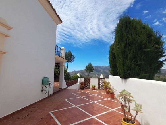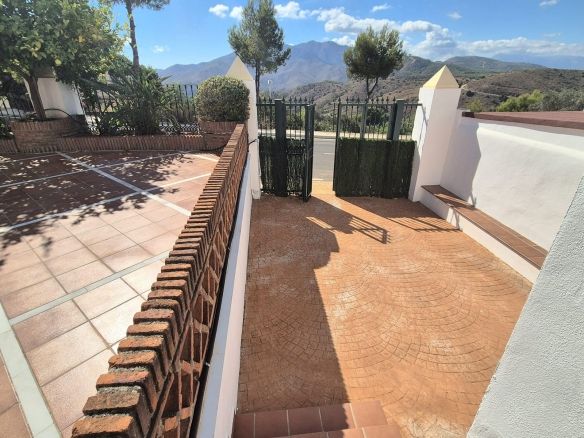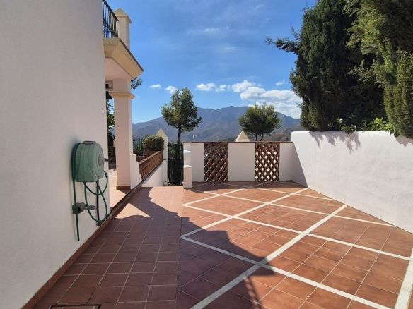 You enter the property via the private front gate, where you have your own parking space. You go up a few stairs to the main level where the property and terraces are. You have a large front terrace that is easy maintenance with flowerbeds that have automatic irrigation in place, a covered terrace with nice seating area and amazing views of the golf course, mountains and the sunset. The property is set over two floors, as you enter to the left you have a full bathroom, stairs that go up to the 2nd level and a under the stairs storage room. In front of you is a large fully equipped kitchen with a door that accesses the back terrace. From the hallway to the right you have the large living / dining room with air conditioning and two patio sliding doors that lead out to the front of the terrace. Upstairs straight in front of you, is the master bedroom with fitted wardrobes, private terrace and en suite full bathroom. To the left of the hallway you have the other 2 double bedrooms with fitted wardrobes and a bathroom to share. The house has 2 split centralizad air conditioning.