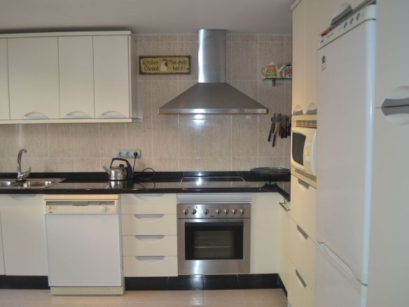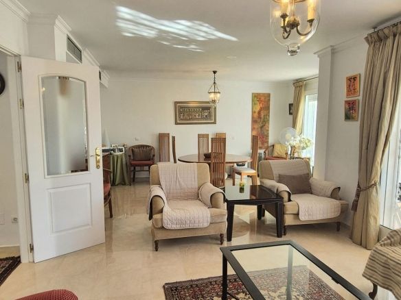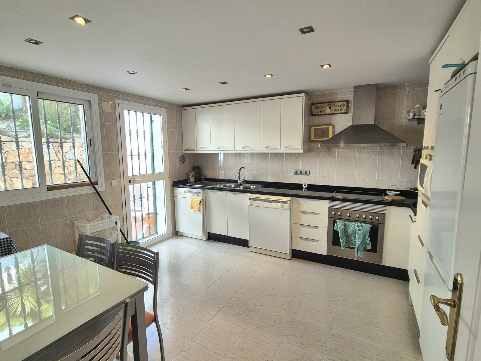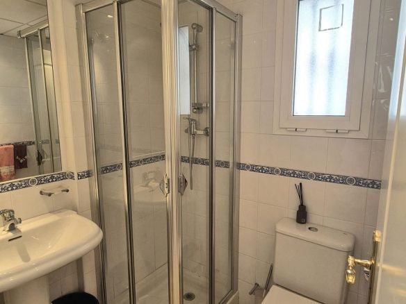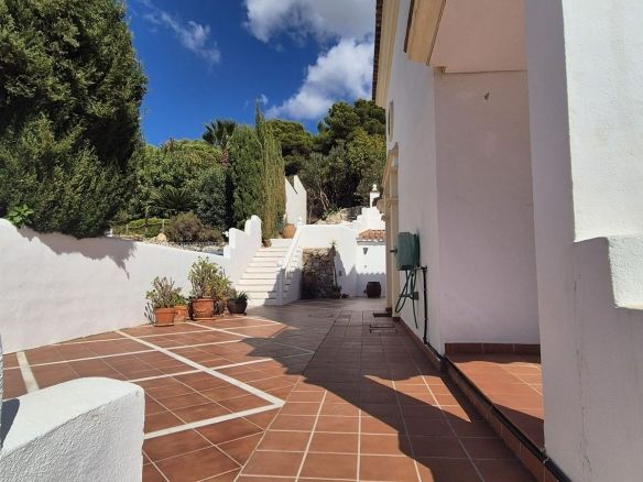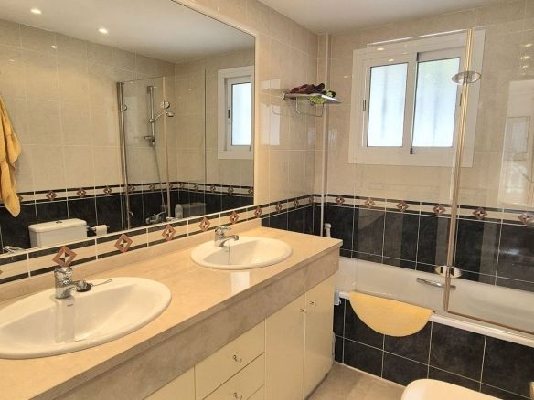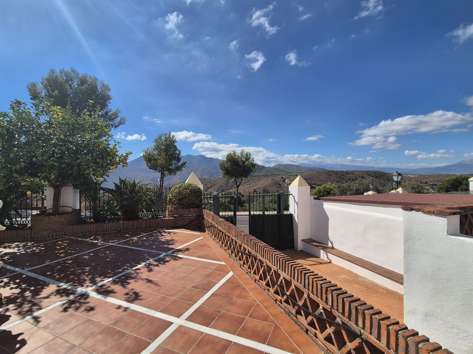 You enter the property via the private front gate, where you have your own parking space. You go up a few stairs to the main level where the property and terraces are. You have a large front terrace that is easy maintenance with flowerbeds that have automatic irrigation in place, a covered terrace with nice seating area and amazing views of the golf course, mountains and the sunset. The property is set over two floors, as you enter to the left you have a full bathroom, stairs that go up to the 2nd level and a under the stairs storage room. In front of you is a large fully equipped kitchen with a door that accesses the back terrace. From the hallway to the right you have the large living / dining room with air conditioning and two patio sliding doors that lead out to the front of the terrace. Upstairs straight in front of you, is the master bedroom with fitted wardrobes, private terrace and en suite full bathroom. To the left of the hallway you have the other 2 double bedrooms with fitted wardrobes and a bathroom to share. The house has 2 split centralizad air conditioning.
