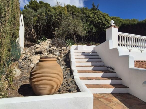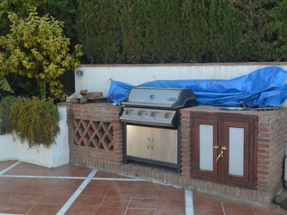 Outside around the back you have 2 levels, the bottom that leads out from the kitchen has a storeroom under the second level and plenty of outdoor dining, the top part has a large terrace with a bbq area, working fountain / stone pond, all very easy maintenance.