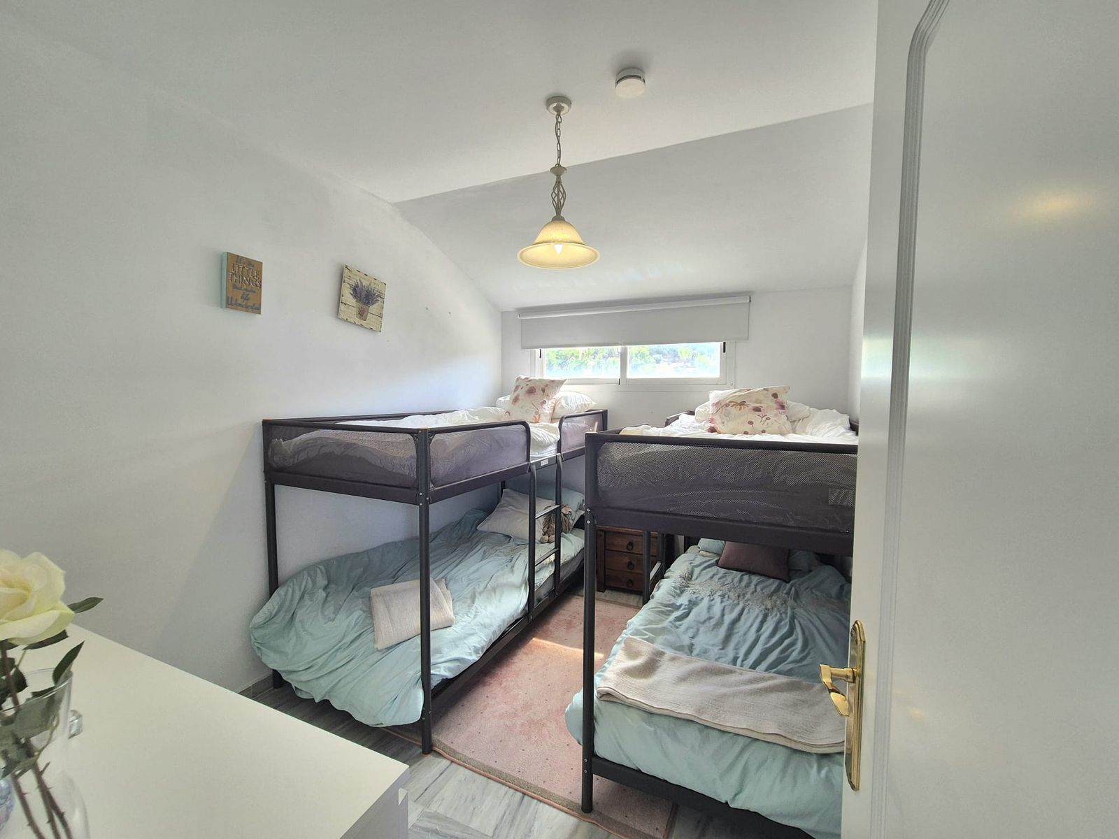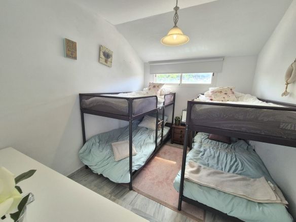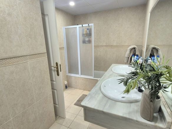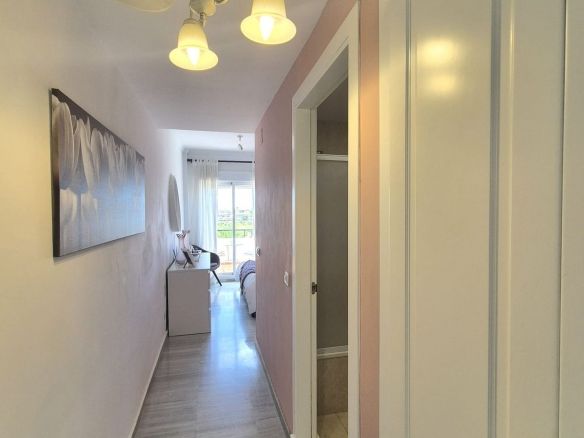 Entering the penthouse into the hallway you have to the right the master bedroom with en suite bathroom with a bath / shower combi and double sinks, fitted wardrobes and access to one of the three large terraces the penthouse has to offer. Next to here you have the bright corner living room with two large french patio doors where you have 2 large terraces south facing with amazing golf and mountain views. You have the fully fitted kitchen to the left of the hallway and stairs going up to the second level, where you will find 2 bedrooms, large wardrobes, full bathroom, and solarium with breathtaking views. A fantastic chill out area to enjoy the evenings.