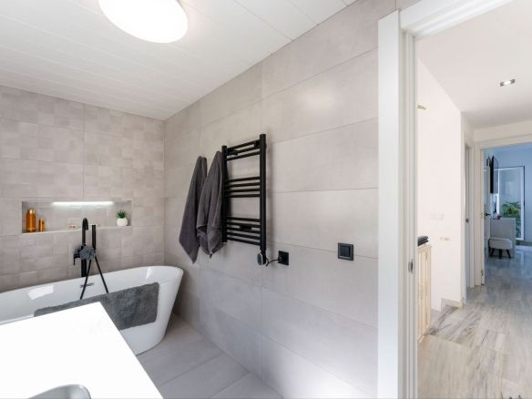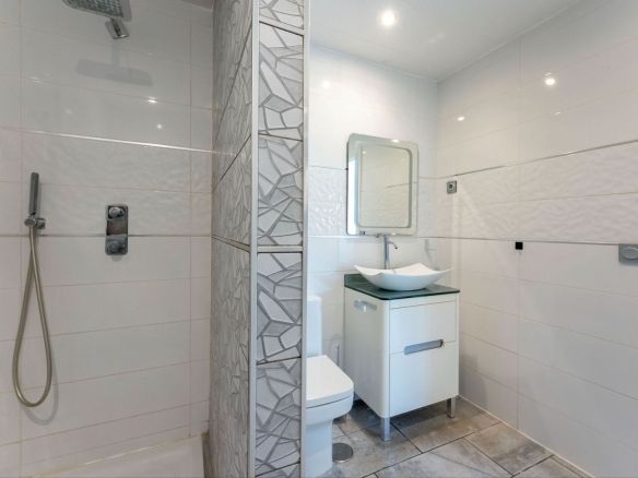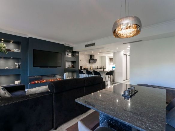 Main floor: Bright living room with an electric feature fireplace and direct access to a private 17m² terrace boasting lovely mountain views. On this level you will also find the fully fitted open-plan kitchen and a guest cloakroom.
