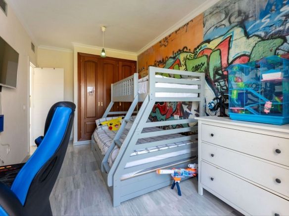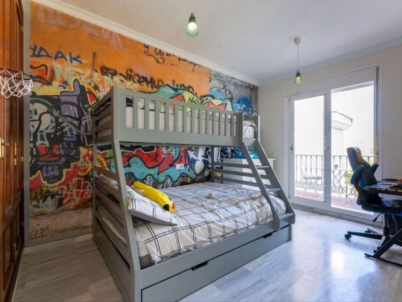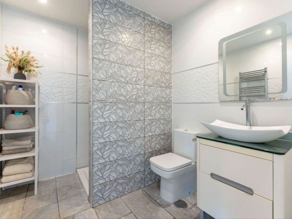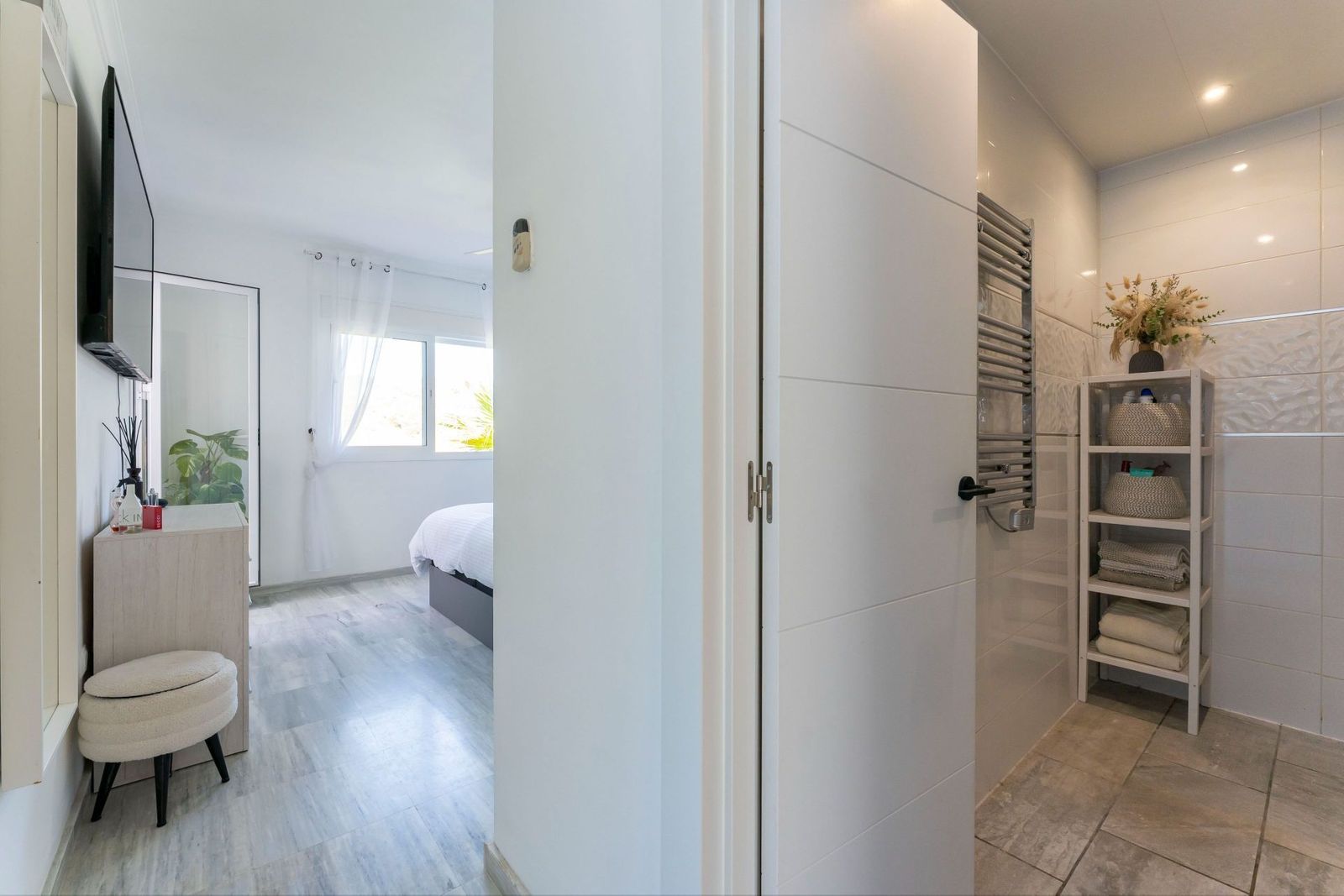 Upper floor: Three double bedrooms with built-in wardrobes, including the master bedroom with en-suite bathroom. The two additional bedrooms share access to a sunny terrace, and there is also a modern family bathroom.