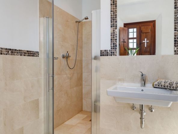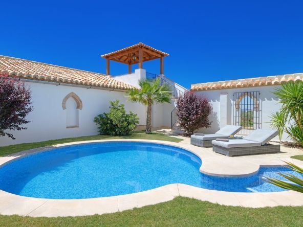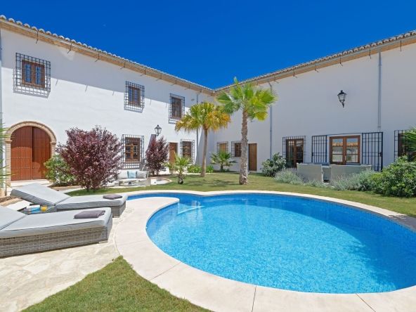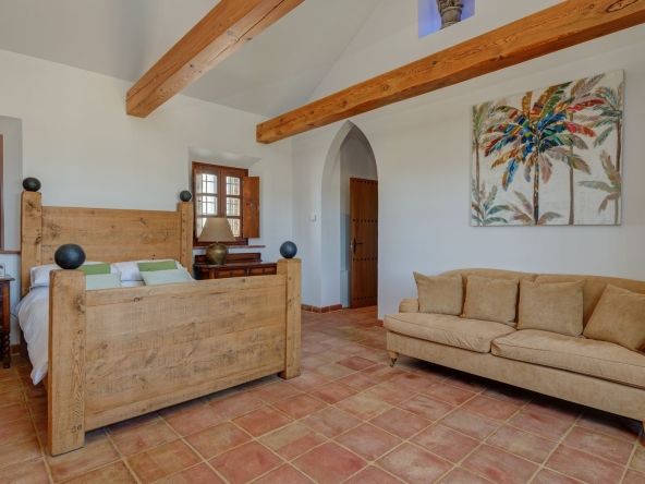 Upstairs, four sumptuous bedrooms, each with their own en-suite bathrooms, provide an intimate retreat, with breathtaking views of the vineyard below. Every room is appointed with high-end finishes, blending traditional Andalusian charm with modern luxury.