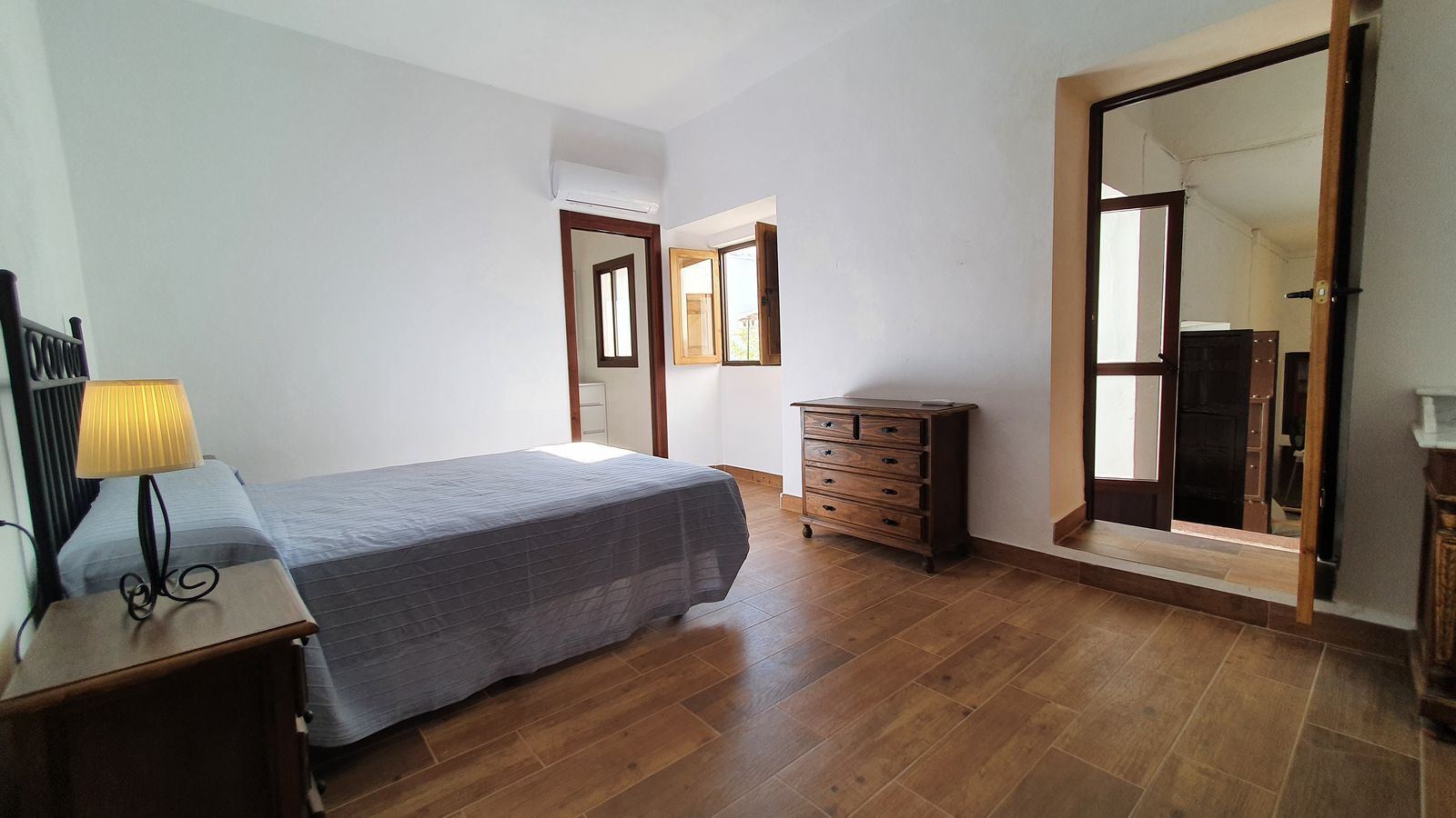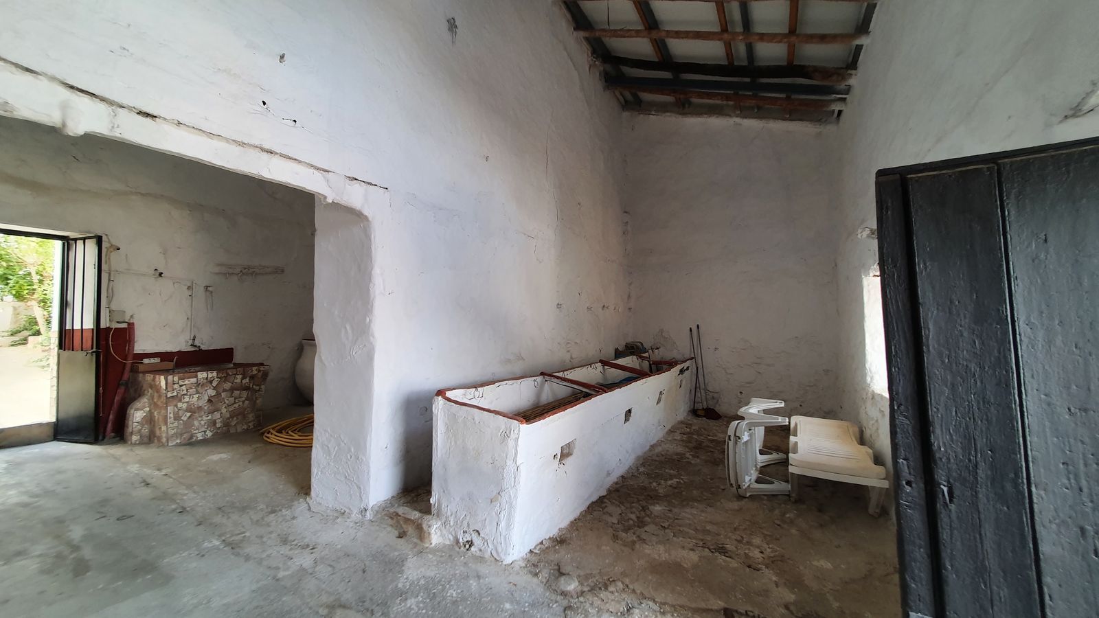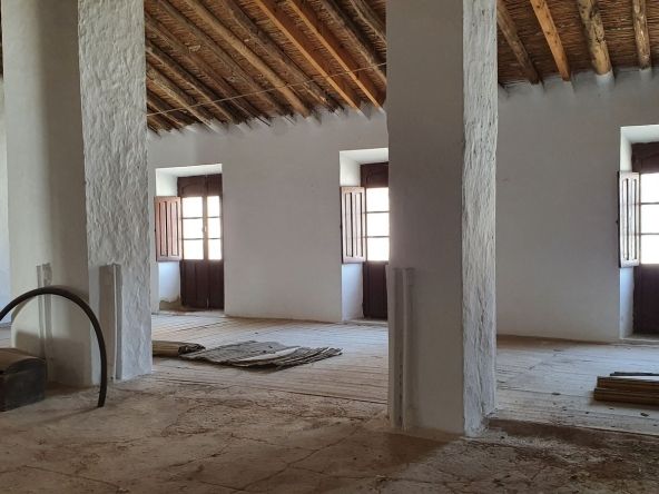 The house currently features 4 bedrooms and 3 bathrooms, but its layout allows for the creation of several additional rooms, including the possibility of an independent apartment on the top floor. The property has undergone partial renovations while maintaining its original character with thick walls, clay hydraulic floors, high beamed ceilings, and traditional wooden doors.