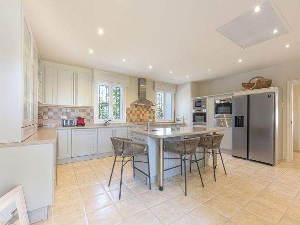 The home welcomes you with a grand double-height foyer that immediately conveys a sense of space and harmony. The main house comprises four en-suite bedrooms, three of which are located on the upper level, each with its own private terrace overlooking the golf course and landscaped gardens. The fourth bedroom is situated on the ground floor with direct garden access, making it ideal for guests or those preferring single-level living. Bright daytime areas include a spacious living room with contemporary furnishings and a separate sitting room, both opening seamlessly onto the terraces. A fully fitted kitchen with breakfast area and garden views complements the layout, while a guest toilet adds convenience.