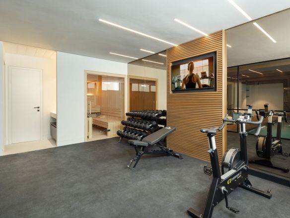 The basement level is a sanctuary of relaxation and entertainment, offering two additional bedrooms, an entertainment lounge with a cocktail bar, an indoor pool, a gym, and a sauna. A private garage accommodates three cars, ensuring convenience and security.