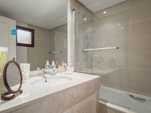 Bathed in natural light, the apartment features a generous living and dining area with working fireplace, that opens onto a partially covered terrace with panoramic views across the Mediterranean, Gibraltar, and Africa; a fully equipped, independent kitchen with ample workspace and well compartmented spacious cabinets; two generous sized en-suite double bedrooms with fitted wardrobes and with the master enjoying direct terrace access; as well as a guest toilet that adds convenience for visiting friends and family.