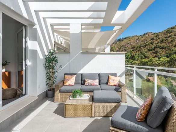 A private terrace extends the living space outdoors, providing an ideal spot for al fresco dining, relaxing, or simply enjoying the pleasant views of the natural surroundings that make Benahavís so special.