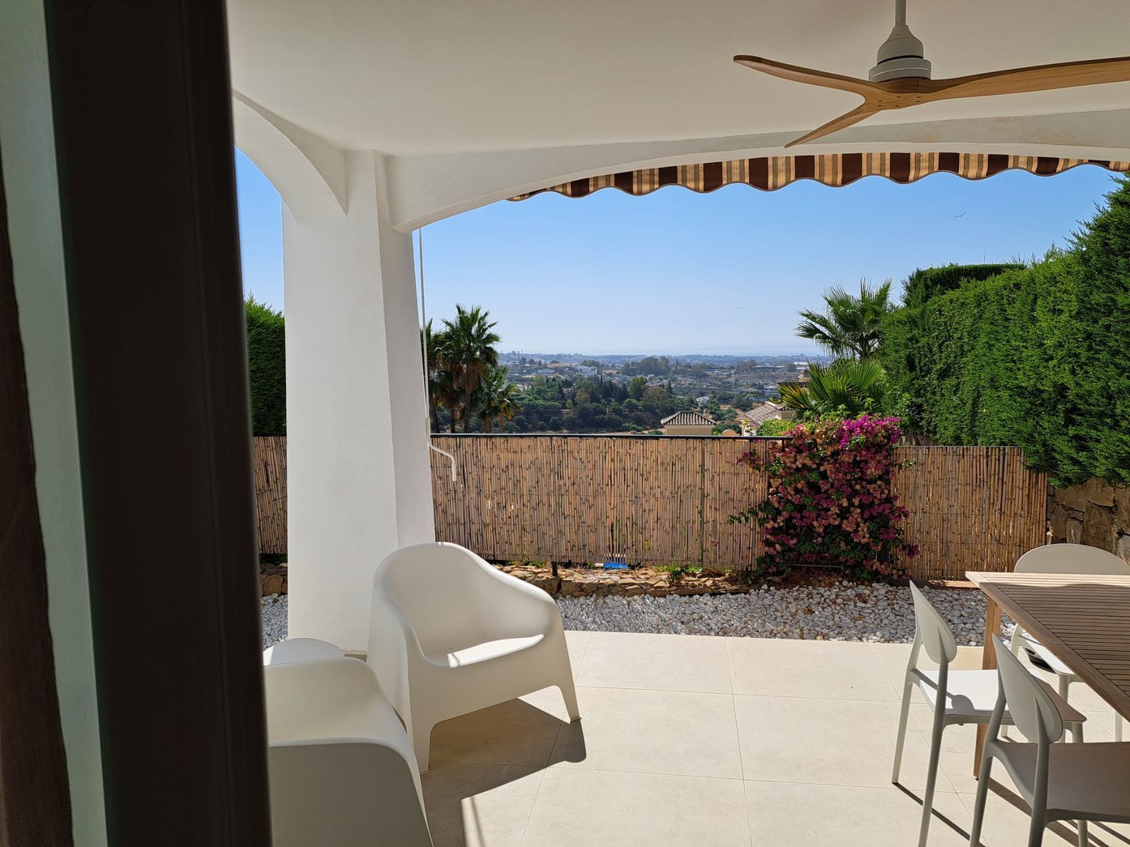 This renovated two-bedroom apartment offers fantastic views of the sea, the golf course, the communal pool, and the surrounding green hills.