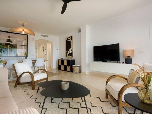 This renovated two-bedroom apartment offers fantastic views of the sea, the golf course, the communal pool, and the surrounding green hills.