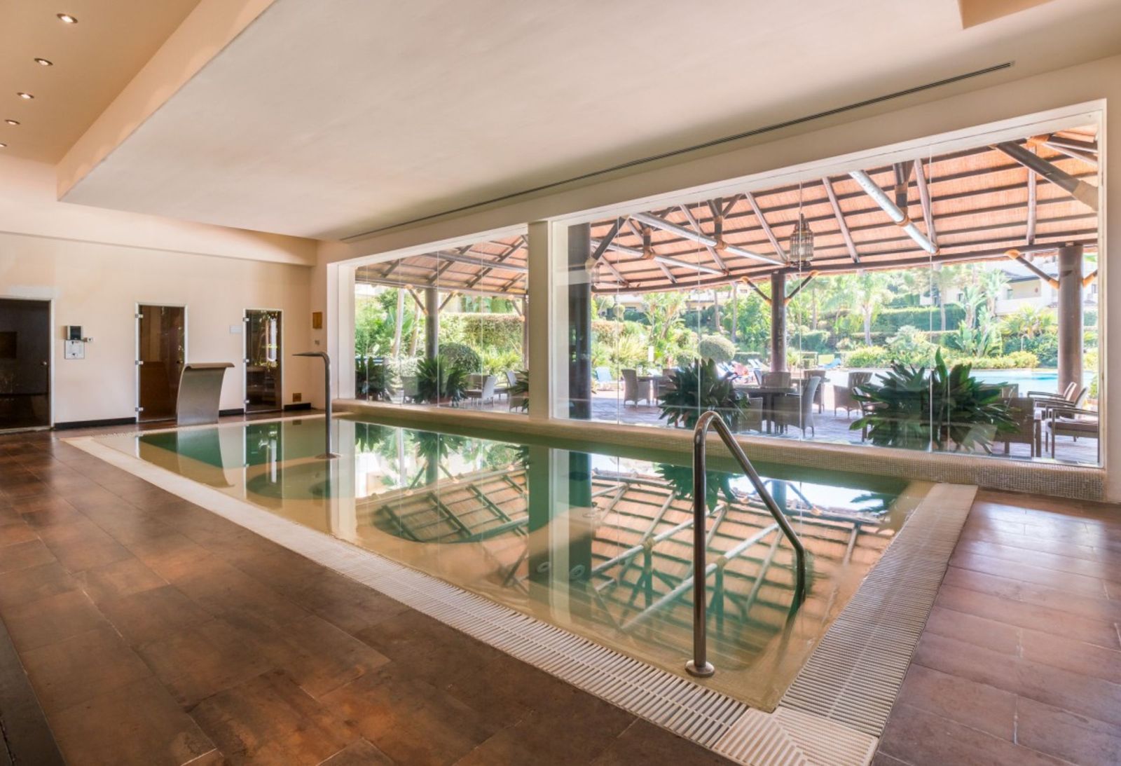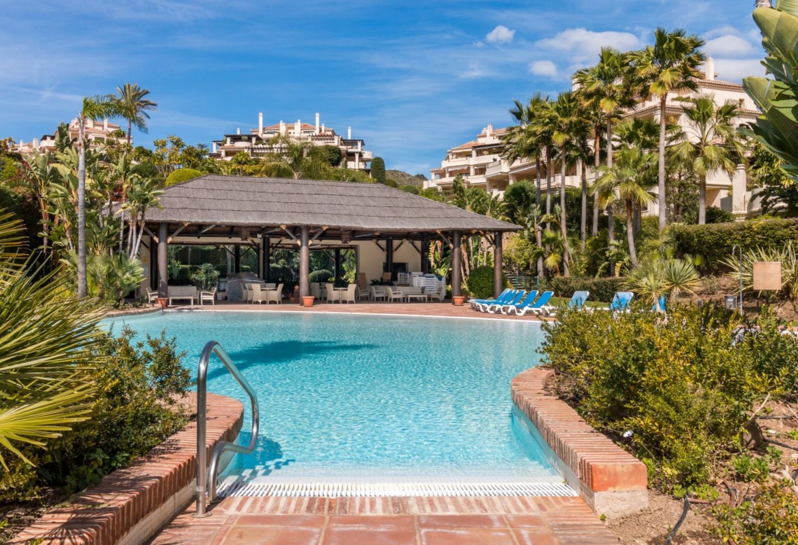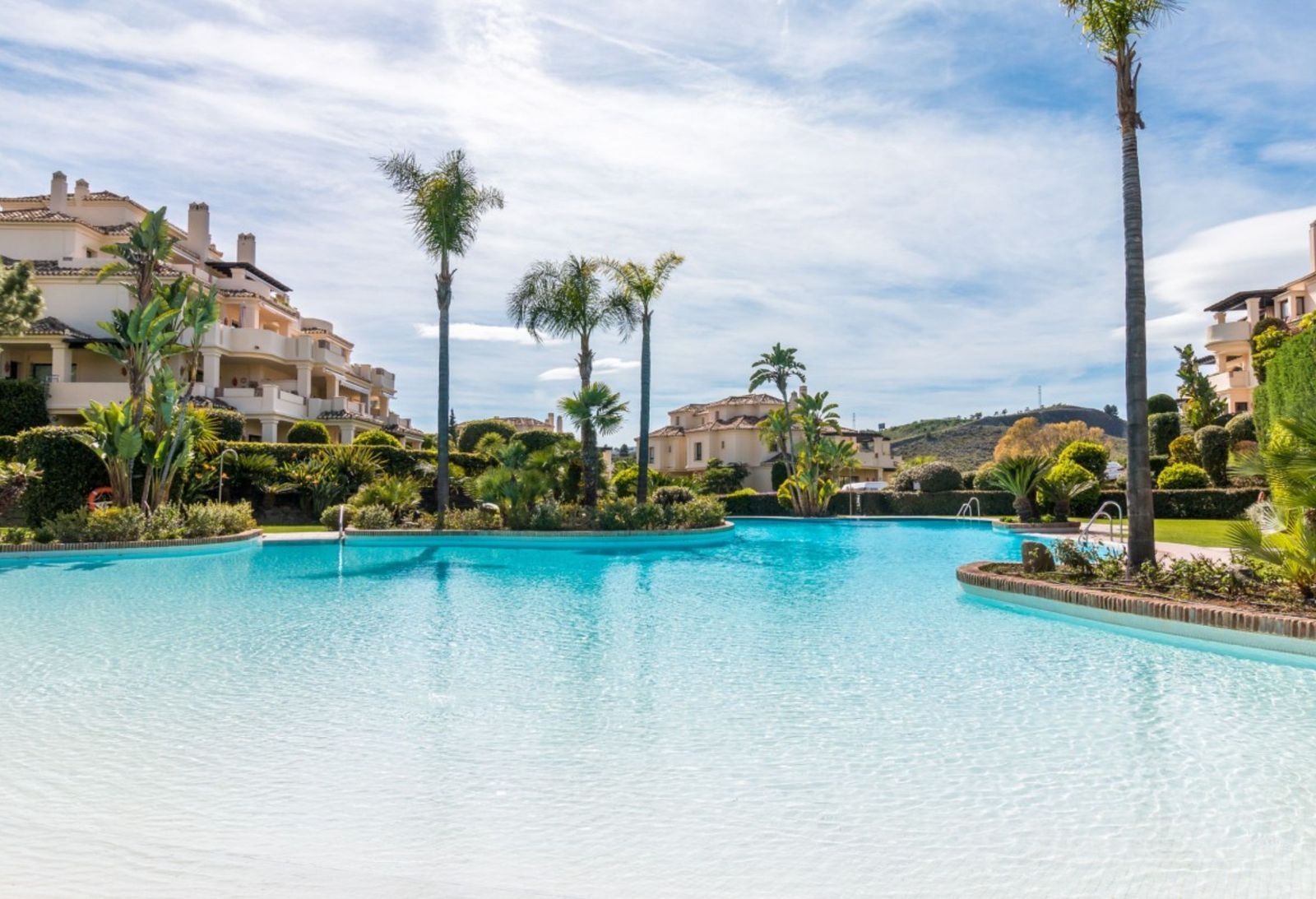 The apartment is on the ground floor and has hot and cold air conditioning throughout. It is a luxurious apartment with marble floors and contemporary furnishings. The development is surrounded by its own golf course and is fully gated with 24 hour security. The grounds have been thoughtfully landscaped and there are a number of pools, including the beautiful indoor pool, gym and spa area.
