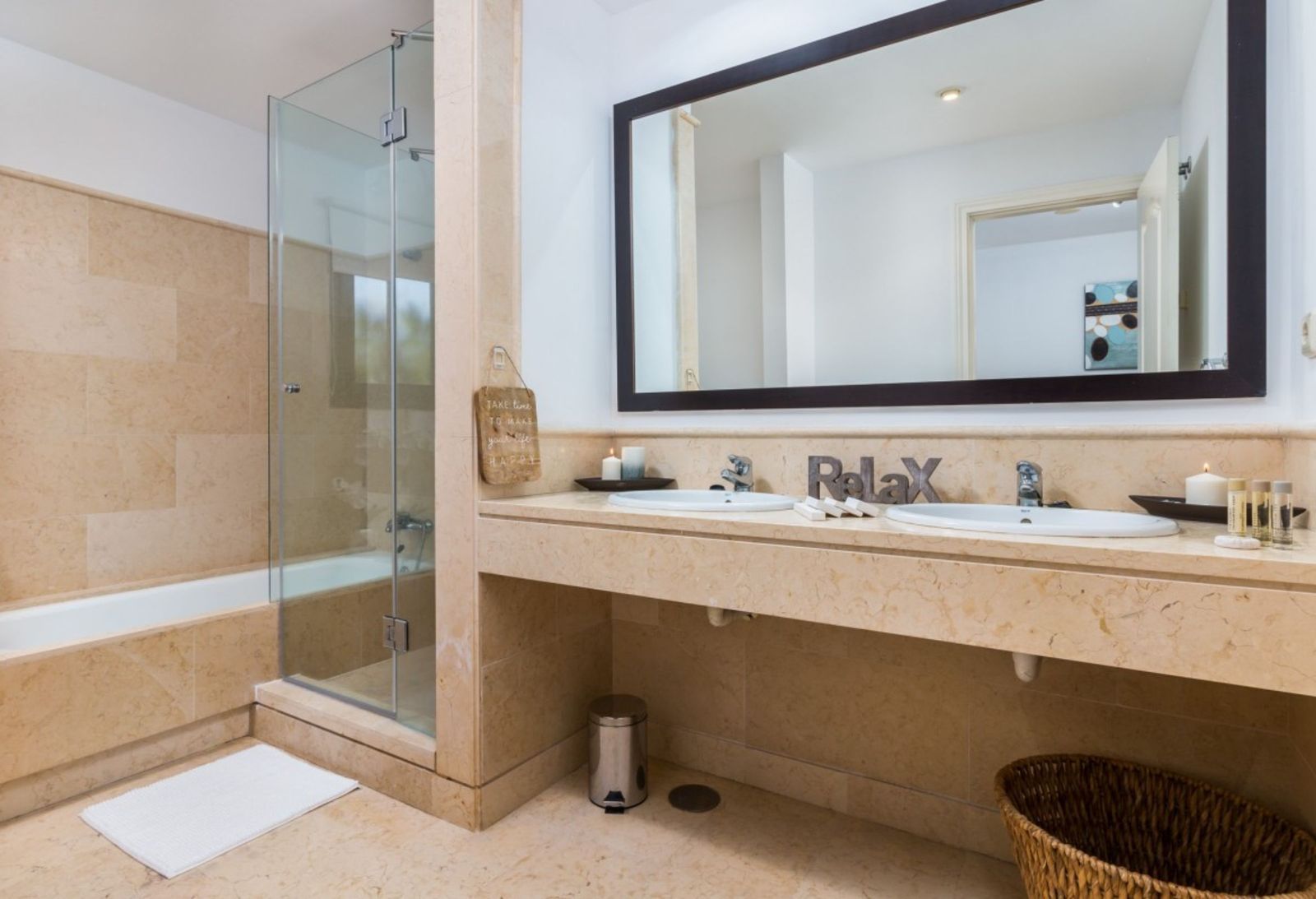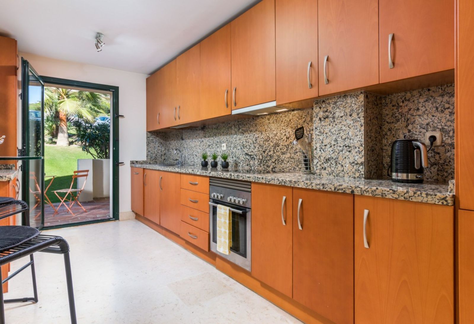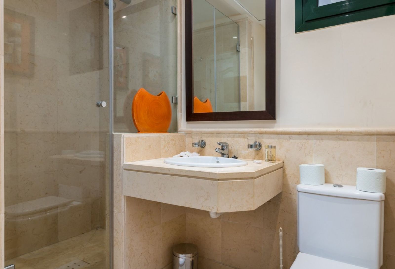 The apartment is on the ground floor and has hot and cold air conditioning throughout. It is a luxurious apartment with marble floors and contemporary furnishings. The development is surrounded by its own golf course and is fully gated with 24 hour security. The grounds have been thoughtfully landscaped and there are a number of pools, including the beautiful indoor pool, gym and spa area.