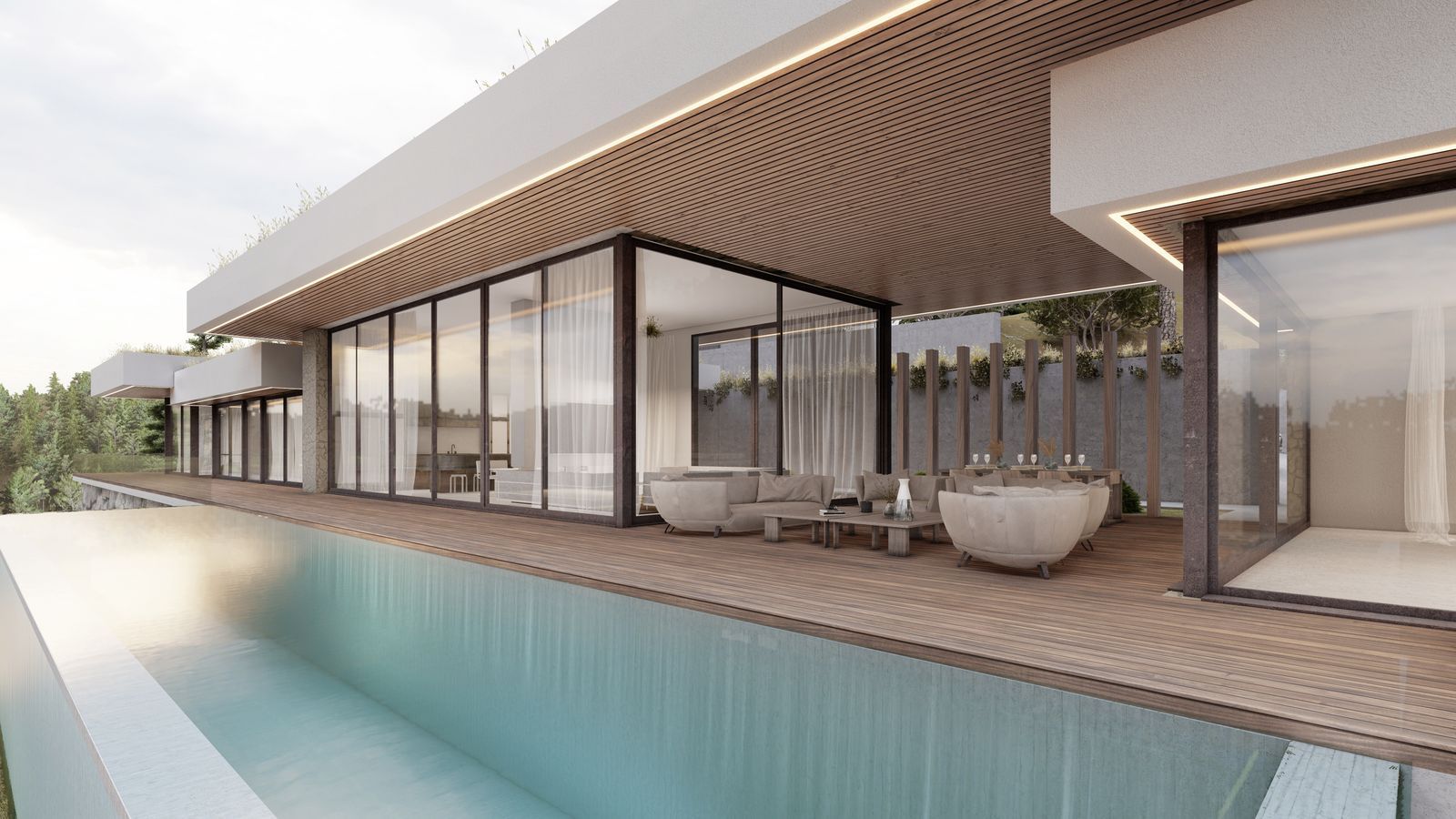 The project is for an ultra modern villa where the each detail was thinking for a contemporary life style. Huge windows up to ceilings will allow enjoying these stunning views from every edge of the property. The villa will distribute into one level which is perfect as a family home and will consist of a spacious entrance leading to a double height living area with an open plan kitchen and the direct access to the outdoor chill out area with covered and uncovered spaces and a beautiful swimming pool, 4 bedrooms, 3 bathrooms, a master bedroom is en-suite with a separate dressing area. All bedrooms offers spectacular sea views and have the access to the garden. Other features are: a possibility to set up a modern gym, a sauna or an entertainment room instead of 4th bedroom, a garage for 2 cars.