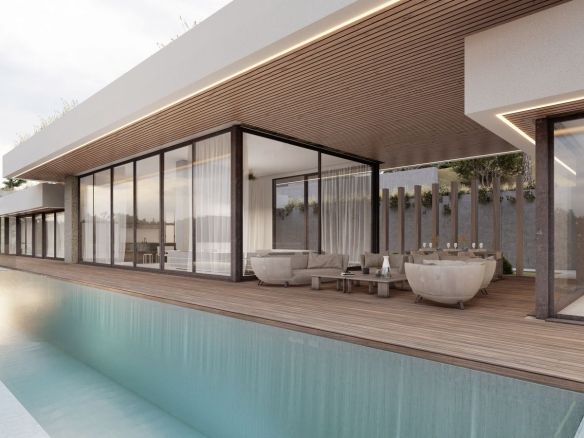 The project is for an ultra modern villa where the each detail was thinking for a contemporary life style. Huge windows up to ceilings will allow enjoying these stunning views from every edge of the property. The villa will distribute into one level which is perfect as a family home and will consist of a spacious entrance leading to a double height living area with an open plan kitchen and the direct access to the outdoor chill out area with covered and uncovered spaces and a beautiful swimming pool, 4 bedrooms, 3 bathrooms, a master bedroom is en-suite with a separate dressing area. All bedrooms offers spectacular sea views and have the access to the garden. Other features are: a possibility to set up a modern gym, a sauna or an entertainment room instead of 4th bedroom, a garage for 2 cars.