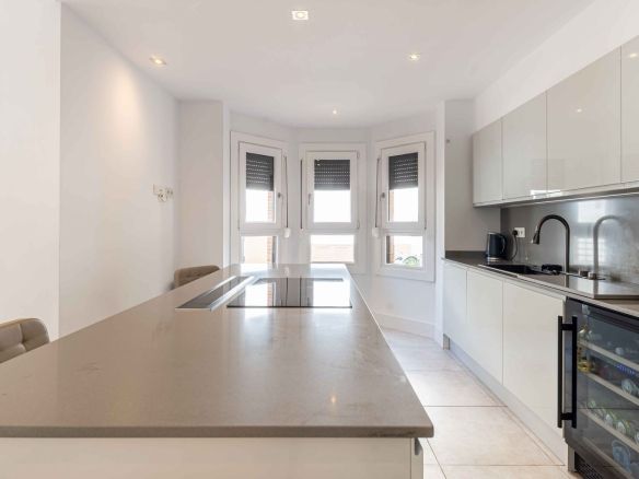 The open-plan living area flows seamlessly onto a generous terrace, perfect for entertaining or simply taking in the spectacular panoramic views. The fully equipped designer kitchen combines contemporary style with practicality.