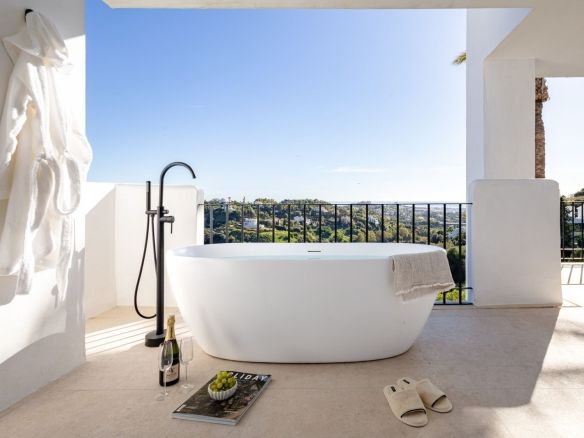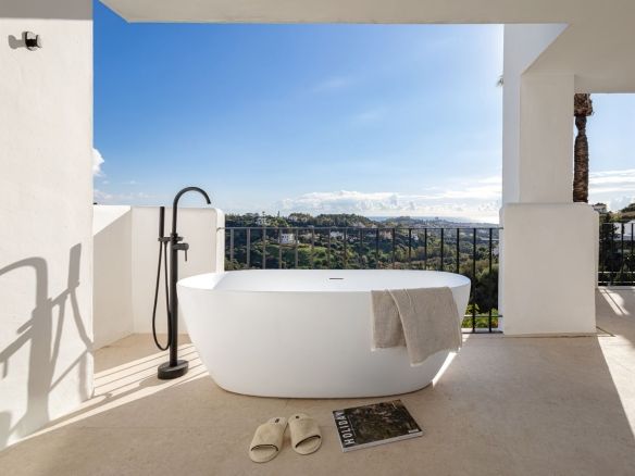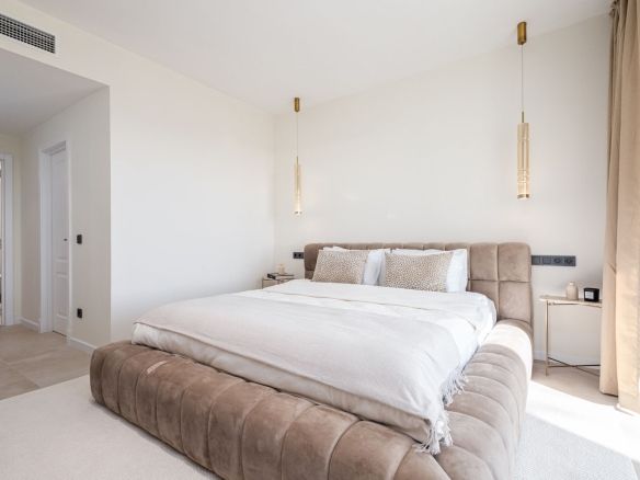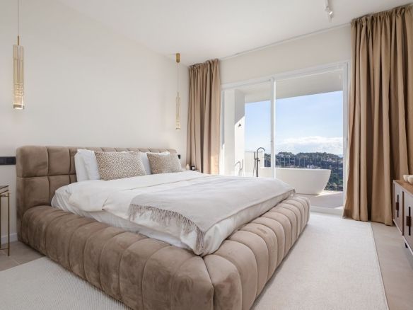 Meticulously renovated to the highest Scandinavian standards, this home features three generously sized bedrooms and two beautifully designed bathrooms. The interiors are flooded with natural light and decorated in calming, neutral tones that create an inviting atmosphere. The pièce de résistance is the spacious terrace, which comes complete with a cozy outdoor bathtub. From here, you can soak in panoramic views of the mountains, the shimmering sea, and the lush fairways of the surrounding golf course – the perfect setting for relaxation or entertaining.