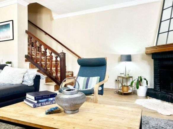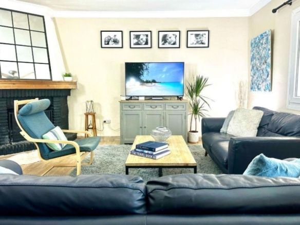 The open plan ground floor comprises a bright living room, dining room and kitchen with an office corner, ideal for working from home, two wood burning fireplaces and a guest bathroom.