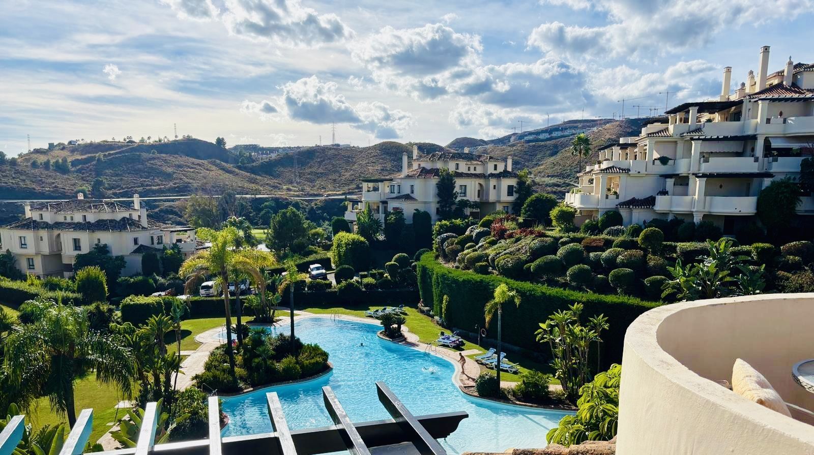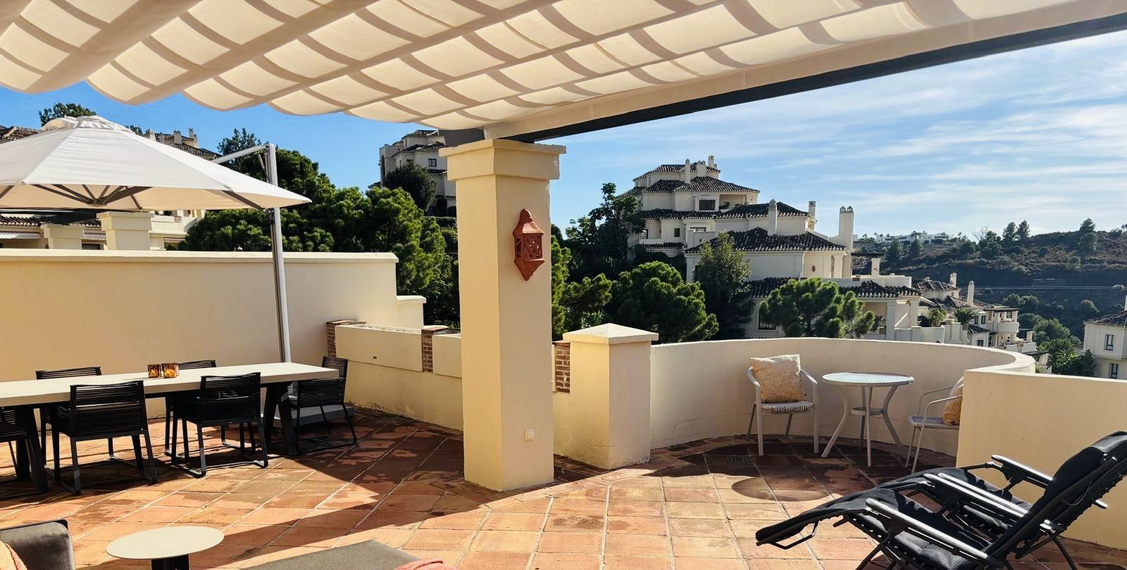 The penthouse is full of light and space with a huge terrace of 106m2. The terrace has beautiful views of the urbanisations luxury gardens with a mountain backdrop.