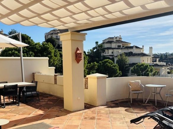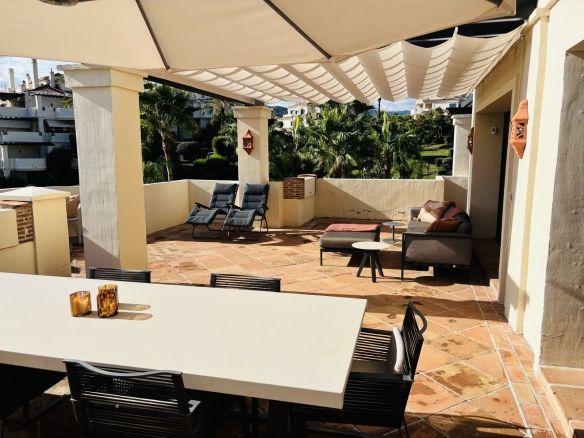 The penthouse is full of light and space with a huge terrace of 106m2. The terrace has beautiful views of the urbanisations luxury gardens with a mountain backdrop.