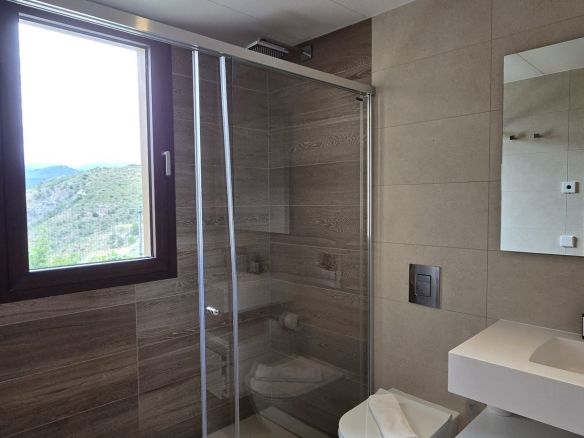 The spacious living room and bedrooms extend onto a large private terrace with pool and sea views. The main bedroom accomadates a King-size bed and en-suite hotel bathroom. The second and third bedroom are spacious opening up to the private terrace, they share a full bathroom with walk in shower.