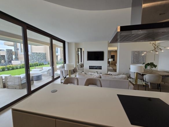 Step inside and this beautiful ground floor apartment and experience a sophisticated, open-plan layout where natural light floods every corner. Floor-to-ceiling glass doors frames opening into the wall to offer the spectacular views, blending the interior with the surrounding landscape of bougainvillea, rosemary, and olive trees. Fully equipped kitchen with Miele appliances, integrated gas fireplace, separate laundry room.