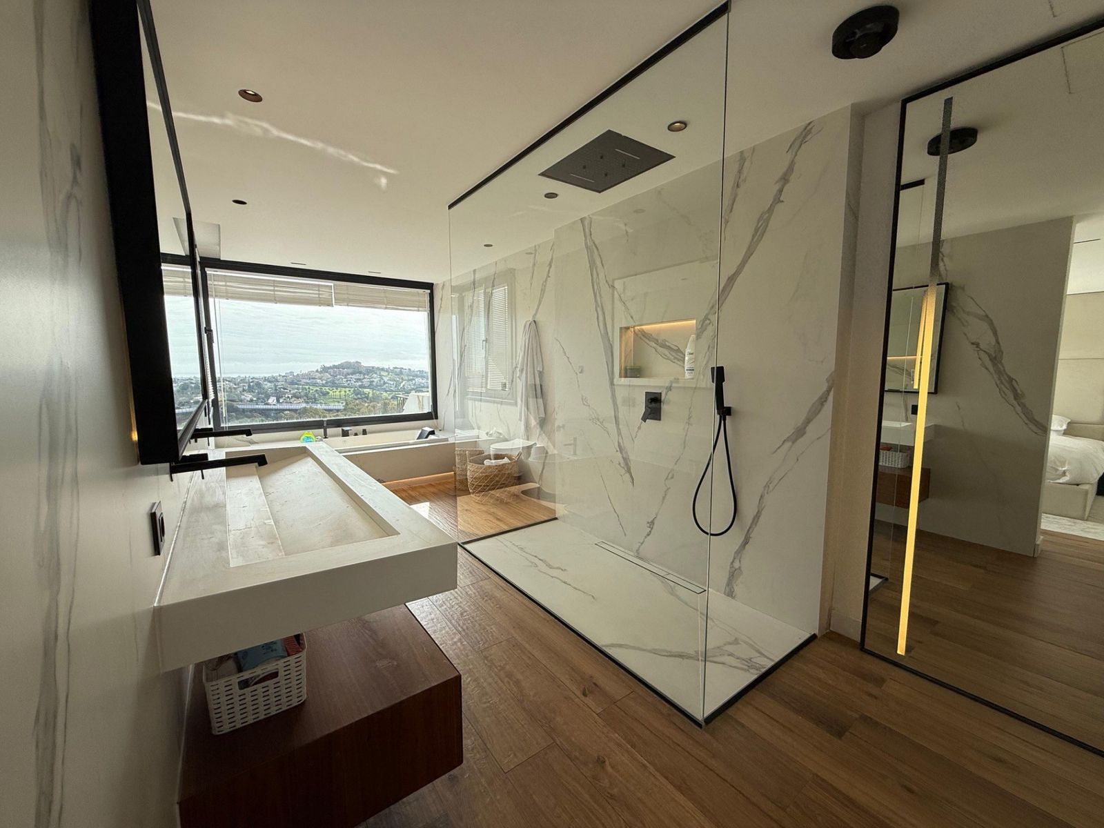 The first floor hosts three elegant en-suite bedrooms, two with private terraces. The top-level master suite is a private retreat, complete with a luxurious en-suite bathroom featuring a rain shower and freestanding bathtub overlooking panoramic views.