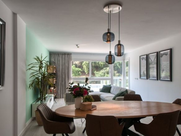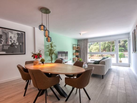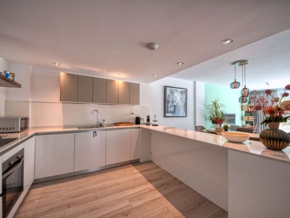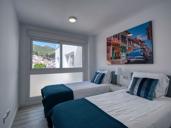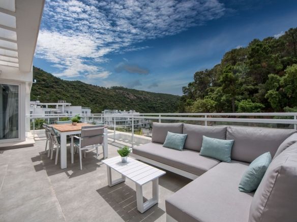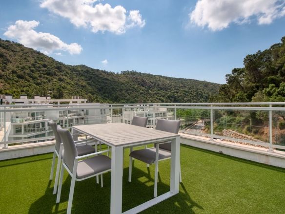 Spacious penthouse in Benahavis with the following layout. The main floor features an open-plan living area leading to a terrace with views over the pool and village. The modern kitchen is fully equipped with top-of-the-line appliances and additional storage.