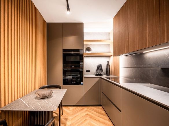 The townhouse features a warm and modern open-plan living and dining area with wooden accents. A large terrace flows from the living room, and all bedrooms have private terraces. The fully fitted kitchen is designed for both style and practicality. Interiors are bright and contemporary, blending comfort with a timeless design.